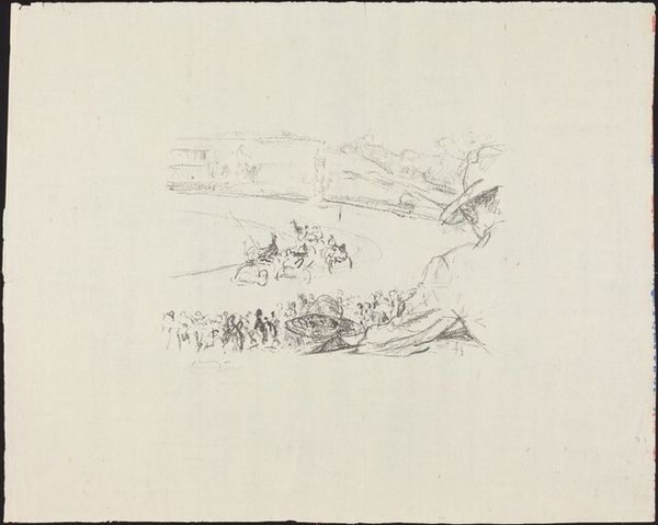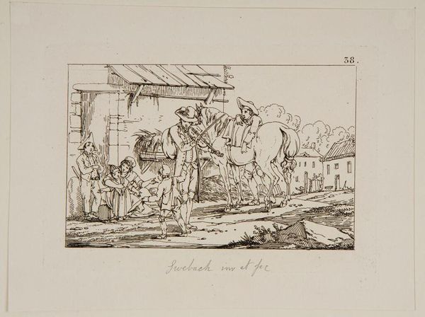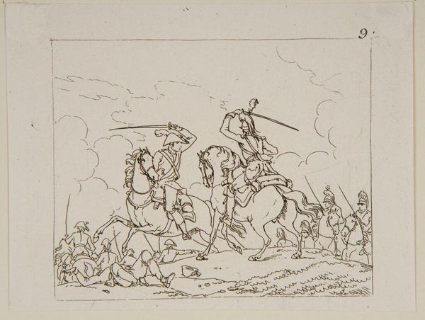 Curator: This is "Plate XXXI" by Jacques-Francois-Joseph Swebach, residing here at the Harvard Art Museums. Editor: It feels light, airy... a fleeting moment. The thin lines give a sense of speed. Curator: Indeed. Hunting scenes like this were popular, reflecting aristocratic pastimes and the social hierarchies of the time. Note how it elevates a leisure activity to a spectacle for public consumption. Editor: And the symbols! The stag, representing wildness and freedom, chased by the dogs and riders... it speaks to a deeper, almost primal conflict. Curator: It is very true. The hunting scene, in its very essence, reflects the taming of nature and the reinforcement of social order through symbolic dominance. Editor: Makes you think about the long echoes of those power dynamics, doesn't it? Curator: It does provide a lens through which to view our own relationship with nature and each other, still.