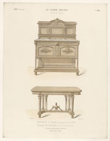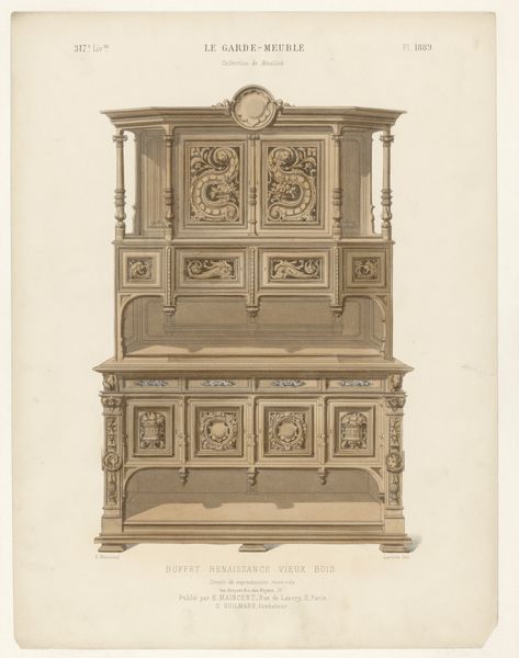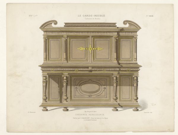 Editor: Here we have an intriguing drawing, "Buffetkast," made sometime between 1832 and 1877, likely a print with watercolor. The precision of the line work combined with the muted palette feels so… deliberate. How do you read this piece from a formal perspective? Curator: Indeed. If we consider "Buffetkast" solely through its intrinsic qualities, what stands out is the meticulous application of line and the considered use of tonal variation. The symmetry, particularly in the cabinet's structure and the positioning of decorative elements, suggests a deliberate striving for balance and order, wouldn't you agree? Editor: Absolutely. The repetition of forms—those vertical panels, the decorative moldings—creates a strong sense of rhythm. I also notice the distinct separation of planes; it's very clear how the artist has defined the receding surfaces. Curator: Precisely. Consider the application of watercolor. Note how the washes subtly articulate form and texture without disrupting the overall linearity. What might this suggest about the artist’s intent and engagement with the object they depict? Editor: Perhaps that the artist focused on clarity, construction, and objective representation. It feels more about delineating an ideal form than capturing a specific material presence. So form dictates material, rather than the other way around? Curator: A keen observation. What have we learned by limiting our engagement with it this way, would you say? Editor: I see a renewed appreciation for the craftsmanship, and how technique shapes meaning. Curator: Precisely. By foregrounding the artist's construction, we unveil the underlying mechanics of representation.