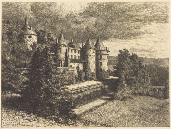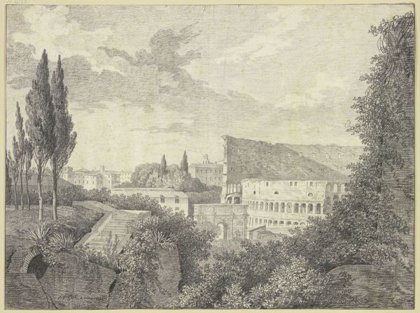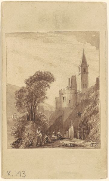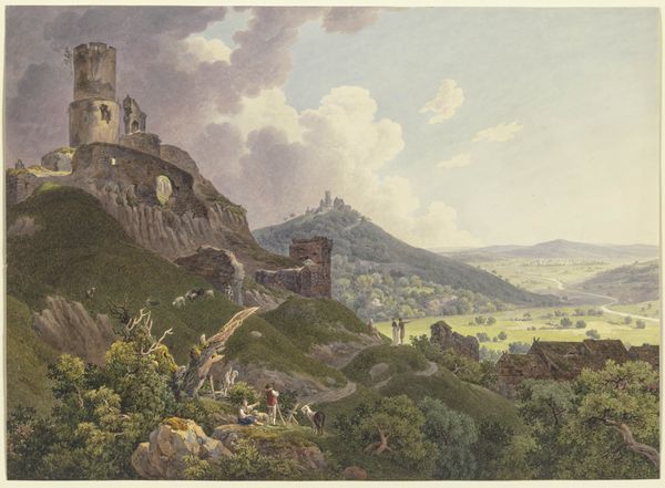 Editor: We’re looking at “View of Lausanne, with a view of the castle and the cathedral,” a watercolor work attributed to Henri Knip. The museum dates it vaguely between 1829 and 1911. I’m struck by the almost idyllic, staged quality of the landscape—it feels like a romantic backdrop for the figures on the path. What draws your attention when you see this piece? Curator: It’s fascinating how this watercolour captures Lausanne through a very particular lens. What appears idyllic to you, is actually a carefully constructed representation serving certain social and cultural functions. The placement of the castle and cathedral so prominently, against a somewhat soft and dreamlike landscape, elevates the socio-political and religious power structures within the town. Consider, who commissioned this work, and who was the intended audience? Editor: So, you're saying the seemingly innocent depiction of nature is more of a carefully curated…propaganda almost? Did landscape painting at this time often serve such purposes? Curator: Propaganda might be a strong word, but it certainly participates in image-making around power. Landscape painting in the Romantic period was frequently tied to notions of national identity and civic pride. Displaying a prosperous and stable town, anchored by its religious and military landmarks, communicated specific values and a sense of order. The relatively diminutive figures and animals on the road emphasize scale. Why do you think the artist included them? Editor: That’s interesting. Perhaps to reinforce the idea of everyday life happening under the auspices of these grand institutions? It creates a sort of implied endorsement. The town thrives under the watchful eye. Curator: Precisely. Think of the painting not just as a visual representation, but as a historical document reflecting and shaping societal values. How does understanding this impact your initial perception of the artwork? Editor: It definitely complicates it. What seemed like a straightforward landscape now feels much more layered. I see how the composition contributes to constructing a narrative about Lausanne’s identity. Curator: Indeed. It makes you question what is presented, and perhaps, more importantly, what is intentionally left out. Editor: Absolutely. It's fascinating how much historical context can reshape our understanding of even seemingly simple artworks. Thanks for helping me see beyond the surface.