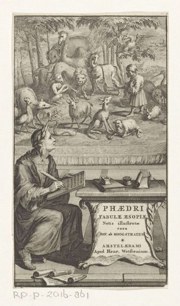Editor: Joseph Mulder’s 1728 engraving, "Schrijver, muze en dieren"… Writer, muse and animals. There’s something theatrical about the composition, like a play unfolding before us. So much symbolism… how do we even begin to decode this? Curator: Look closely. Observe how the figures interact with each other and within the space. The writer and the muse, classical figures representing intellect and inspiration, frame a scene filled with animals. But this isn't merely a gathering; it evokes Aesop's fables, morality tales passed down through generations. What do you notice about the positioning of the animals? Editor: They seem to be arranged almost according to temperament, but there are a couple of human-like figures mingling among them as well. Some of them seem like stock characters, perhaps from the fables themselves. Is that an allegory about society itself, where people learn from their relationships with each other? Curator: Indeed! Consider how animals, long used to symbolize human traits – the lion for courage, the fox for cunning – appear here. Are they truly wild or acting out assigned roles in a well-rehearsed play? It brings up a whole debate about identity and perception! Also, consider the lyre… a visual cue connecting music, poetry, and history, blending to create a harmony between the worlds. Editor: So the engraving uses these familiar fables as a mirror reflecting societal values and perhaps, a gentle nudge toward self-reflection? It’s a multi-layered message hidden in plain sight! Curator: Precisely. It encourages the audience to look beyond the surface and find resonance with the historical context of its imagery. Visual languages reveal culture. Editor: That’s a great explanation and so very helpful. Thank you. It’s made me consider art in a whole new way, from the perspective of lasting symbols. Curator: My pleasure. We remember who we are from the things that last.