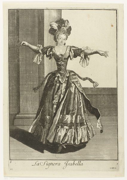 Editor: Here we have Gerard Valck’s "Vrouw met castagnetten," an engraving from between 1694 and 1715. At first glance, there's something almost comical about the figure – maybe it's the overly elaborate dress or the way she's holding the castanets? How do you interpret this work? Curator: Oh, I adore this piece! It’s more than just comical, it’s a fantastic snapshot of the Baroque period's love for theatricality. Imagine this engraving not just as a portrait, but as a glimpse into the opera scene of the time. The exaggerated costume and pose, perhaps, is intended as a character study of one of the cast members; almost a form of early celebrity culture! Editor: So, it's kind of like a promotional image? Did engravings like these have a particular purpose? Curator: Precisely! Think of it as a form of advertising for the opera. It's an opportunity to get excited by an engaging story, conveyed by means of attractive garments in attractive locations! It probably found its way into collectors’ albums as an accessible luxury item. Look at how precisely every detail has been rendered by Valck – doesn’t that precision add to your feeling of accessibility? It is through detail like this, perhaps, that audiences found the confidence to trust in that image for inspiration. Editor: That’s fascinating! I didn’t realize how much information you could glean just from one little engraving. Curator: It's amazing, isn’t it? It makes me wonder: what sort of cultural products today provide such detailed and lasting insights for the people of the future? Editor: Food for thought indeed! It has helped me see the past in a completely new light and, somehow, relate to the present, too.