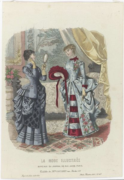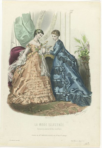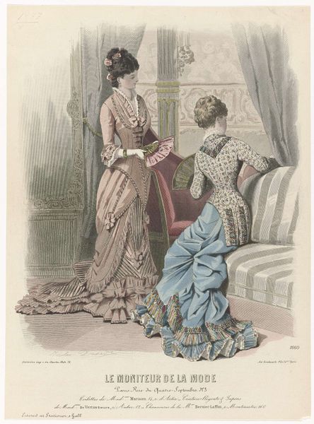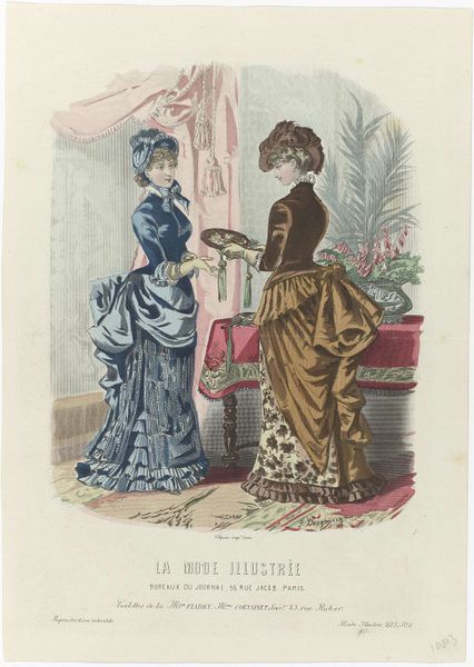 Curator: Take a look at this lovely print: "La Mode Illustrée, 1884, No. 46: Toilettes de Mme Delaunay (...)," created in 1884 by J. Bonnard. It's a watercolor illustration showcasing two women in fashionable attire. Editor: Oh, hello ladies! It looks like they’re having a tea party… or maybe gossiping about which hat to wear to the opera. There’s a softness to the scene – it feels intimate, almost like peeking into their parlor. Curator: Indeed. We see here a genre painting that presents highly constructed representations of femininity deeply embedded in its specific time, but which invites contemporary inquiry on intersectional themes such as identity, gender, and class. Editor: "Highly constructed"... that's one way to put it. All those bows and frills, and the corsets – yikes! It makes you wonder how much freedom these women really had, underneath all that… upholstery. But hey, maybe they liked it. Comfort is relative. Curator: Certainly. These fashion plates functioned as tools of social positioning. Through the depiction of such sartorial elegance, women aimed to achieve or reinforce a place within a stratified society where one's attire communicated one's socio-economic status. It begs us to ask questions of access and exclusion in a Bourgeois Paris… Editor: True, it was like wearable wealth. Though, let's be honest, as an artistic composition, the artist manages to do quite a bit with the watercolours. Notice how he captures light on the fabrics; each fold seems almost touchable! Also, there's something strangely calming about these muted pastel hues. Curator: I agree. Moreover, we must read it in context to fully grasp its historical and cultural resonance. Academic art like this was designed to uphold a very specific vision of beauty, domesticity, and female identity— Editor: A vision crafted by men, no doubt. Curator: ... precisely. Still, it presents a valuable opportunity to explore these societal constructs through art history and feminist theory. Editor: Well, for me, beyond the social implications, this watercolor just tickles my fancy with its aesthetic sensibilities. But absolutely, engaging with art involves acknowledging all its many layers! Curator: Precisely. Thank you for engaging with this complex print with me! Editor: The pleasure was all mine.