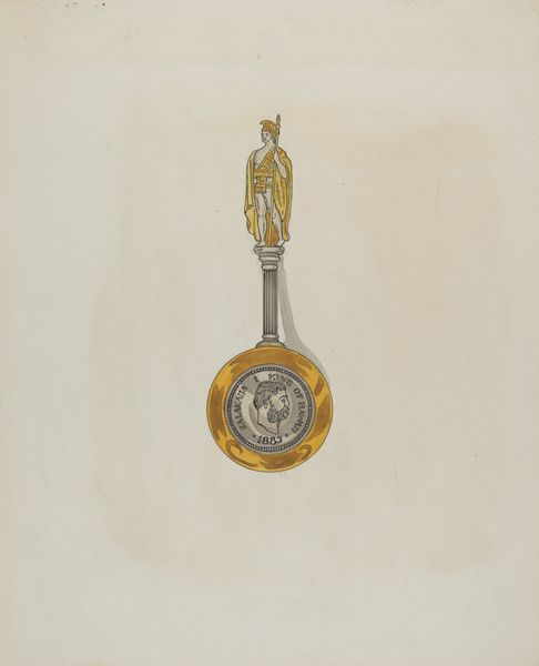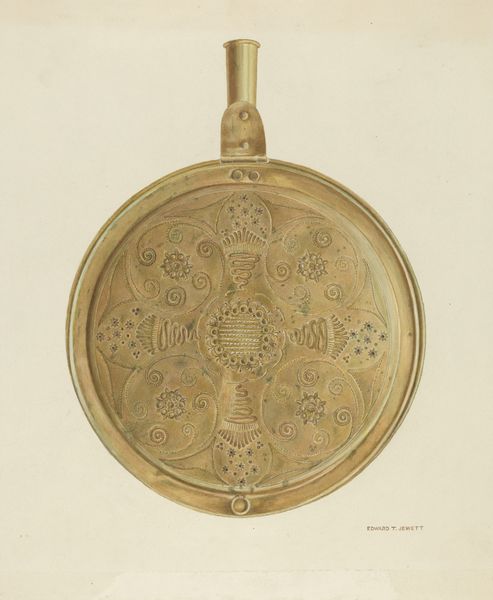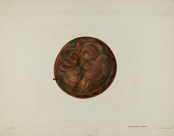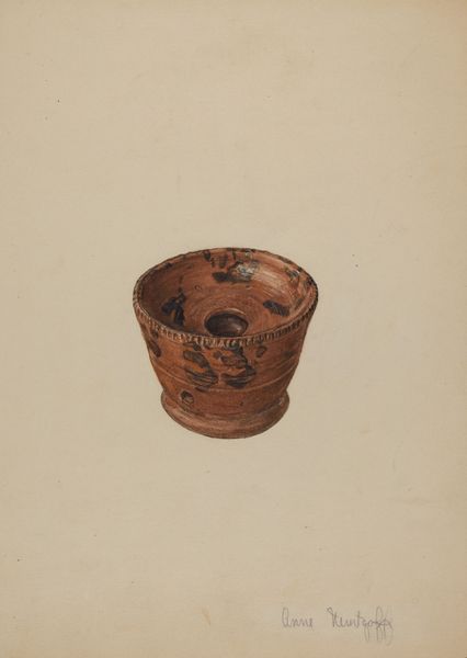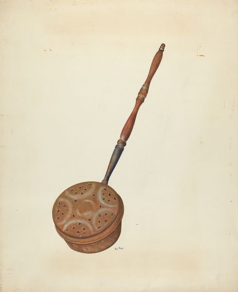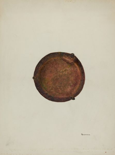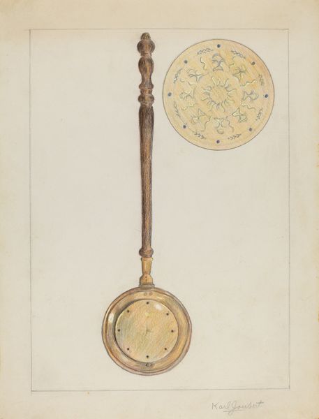 Curator: This watercolor and charcoal drawing, titled "Panslider," was created circa 1937 by Harry Grossen. What's your first take? Editor: It’s humble, somehow—this perfectly ordinary kitchen object elevated by careful artistry. The detail captures its lived-in texture; it's not idealized but truthfully worn. There’s an intimacy here. Curator: I agree, there is an interesting element of realism. Looking through a broader lens, still life paintings offer intimate glimpses into the lives of the everyday. Considering that this was created during the Great Depression, how might that context inform the subject choice and our understanding of this work? Editor: The Depression was marked by widespread unemployment and hardship. Creating beauty out of mundane objects could be viewed as an act of resistance against prevailing despair and economic constraints, or simply documenting the simple reality of kitchen work during the Depression era. Curator: It is tempting to read into Grossen's intentions through the lens of economic history, but how can we balance that interpretation with a deeper awareness of gender? Consider, the subject is, after all, an item usually wielded by women within the domestic space. Editor: Yes, we should pause and remember labor that is so frequently undervalued. In foregrounding this tool, is Grossen tacitly drawing our attention to the contribution of women's invisible work, an attempt to offer this contribution as an artifact of American industriousness? Or perhaps even offering it up as a sign of labor exploitation? Curator: Such nuance speaks to the value of art's layered ability to signify across time and context. The placement against an off-white backdrop offers no cues. Our attention is squarely focused on the thing itself. Editor: Yes, removed from its typical backdrop of the kitchen, "Panslider" transcends the purely utilitarian. What lingers for me is its ability to serve as an intersectional artifact, opening multiple avenues for us to investigate work, gender, and historical narrative through the artwork itself. Curator: Indeed. It’s fascinating how one unassuming pan can spark so much inquiry. Editor: Exactly, and that's often the most exciting power of art.