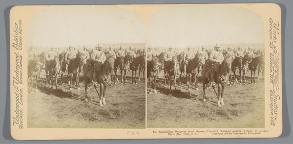 Curator: The piece before us, created by Guy de Coral & Co. around 1898 or 1899, captures Queen Wilhelmina's visit to an army review on the Renkumer Heide. It's a gelatin silver print. Editor: It's immediately striking, this photographic print. The light is beautifully diffuse, rendering almost a dreamlike quality to the procession of horses and riders. It seems very traditional. Curator: Traditional indeed. But notice the subtle gradations in tone, from the darker foreground to the almost ethereal background. It creates a flattening effect, disrupting the traditional illusion of depth that would be typical in earlier representational modes. Also, observe the deliberate placement of Queen Wilhelmina, slightly off-center yet undeniably the focal point through contrasting light. Editor: She certainly exudes presence even amidst the ranks. To me, the repetition of the horses and their riders evokes a sense of power and order, quintessential emblems of a stable monarchy preparing for the 20th Century. And of course, the vast landscape becomes symbolic; it stands for the vastness of the Netherlands and the duty to protect it. Curator: An interesting interpretation. Yet, I am drawn to the ways in which the image refrains from traditional heroic imagery. The composition is somewhat understated. We have an absence of vibrant colors or sharp focus. The romanticization of monarchy and militarism has some very subtle breaks here in pictorial language. It’s fascinating to observe how the medium impacts reception, in the dawn of this new technology. Editor: Yes, in capturing Wilhelmina on horseback amongst her troops, the image consciously echoes a deep rooted visual trope of leadership, strength and cultural identity through monarchy. The symbolic language here ties her reign to the longstanding martial tradition. Curator: Well, it's clear the conversation between form and symbolism yields layered historical understanding. Editor: Precisely. There’s so much to consider how history shapes not only what is recorded, but importantly how it is framed.