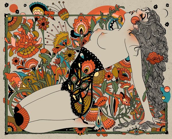 Curator: Here we have "Dormant Luster" by Cassidy Rae Marietta. This vibrant painting feels steeped in pattern and decoration. What strikes you first about it? Editor: Pure joy. It's an explosion of color, almost psychedelic, with this central figure surrounded by... well, everything! The floral patterns are intoxicating. Curator: Yes, look closer at how the floral motifs repeat and layer. It moves from figuration towards something more abstracted in those background repetitions. Editor: It’s funny, the title suggests something "dormant," but there’s so much energy! Perhaps it's the potential waiting to bloom. Or it might be speaking about how pleasure exists on a tipping point with the materials of excess and mass-production of decorative designs. Curator: Interesting idea, focusing on material. Considering the process, the artist uses acrylic paint to create that really defined Pop Art look. How does the use of paint play with the themes, in your opinion? Editor: It contributes to the artificiality, in a way. Everything is heightened. These colors are so vivid, it feels almost synthetic, even though it's nature represented, right? The contrast draws me into her narrative – who is she, what's her context. The flowers are tools! Curator: There’s a deliberate tension, the juxtaposition between figure and background. Notice those bolder linear elements used throughout; a very specific choice. And of course, a great example of pattern repetition here too, wouldn't you say? Editor: Yes. They work on a micro and macro scale at the same time, which mirrors how design elements find their way to our daily lives, even in our own homes. It makes it extremely lively. Makes me want to put on some groovy music. Curator: So, overall what feelings remain when observing such work? Editor: A feeling of liberation, I guess. A celebration of seeing things that we think of as simply pattern come alive again. What about you? Curator: Well, for me, it is mostly thinking about what the design production has to say about identity as it comes and goes. But that’s something for everyone to reflect on on their own.