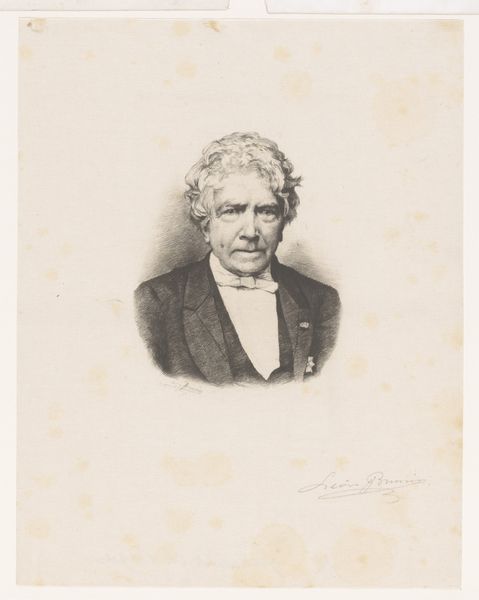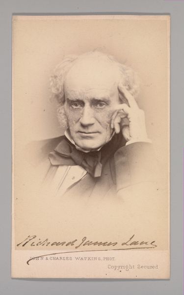 Editor: This is a portrait of William Etty from the 1860s, taken by John and Charles Watkins. It's an albumen print currently housed at the Met. The man seems… distinguished, in a very old-fashioned way, like a figure from another era. What catches your eye in this photograph? Curator: It’s the ascot, partially obscured, isn’t it? How the trappings of high society—here rendered with nascent photographic techniques—tend to obfuscate as much as reveal the individual. Look closely. Do you perceive a man assured of his station, or rather a visage haunted by time? Editor: I can see what you mean about being haunted. He seems preoccupied, but also self-possessed. Curator: Indeed. It’s fascinating to consider Etty's legacy through the lens of this portrait. The play of light and shadow across his face mimics the dance between his classical aspirations and the societal constraints of his time, especially considering the frank sensuality in his paintings. Editor: So the portrait isn't just about representing the sitter, it's about the dialogue between his art and society? Curator: Precisely! Consider how symbols shape perception, creating meaning far beyond surface appearances. Editor: I hadn't thought about the symbolic nature of a portrait, really. This makes me look at all portraits in a new way! Curator: All images, consciously or unconsciously, partake in this dialogue of symbolism, hinting at the psychological weight they carry. Editor: Thanks! I'll certainly be paying closer attention to those hidden layers from now on.