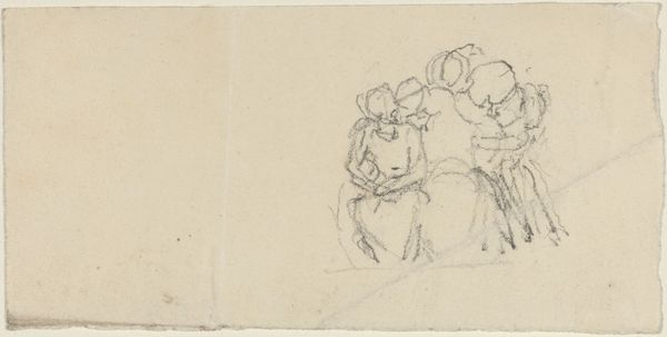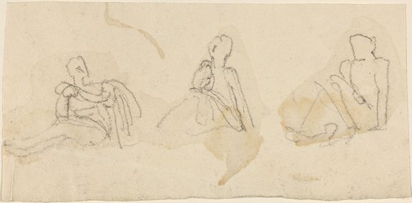 Editor: This is "Two Seated Female Figures with Arms Lifted Overhead" by John Flaxman, an ink drawing, very minimal. It gives off an immediate sense of antiquity and almost… hieroglyphic simplicity. What strikes you about this work? Curator: What tickles my fancy is how seemingly unfinished it is, like catching a fleeting thought on paper. Those figures, etched with such delicate lines, appear caught in a moment of reverie or perhaps supplication. Their raised arms...it's like they're conductors of unseen energy. Makes you wonder, what are they reaching for, do you think? Editor: It’s the economy of line that gets me! I mean, so much is suggested with so little. It feels deeply personal, a private meditation almost. It's like we are viewing the artist's immediate thoughts on paper. Curator: Exactly! Flaxman, he was really into the classics. He felt the past, lived it almost, in his bones. Those minimal lines, they remind me of ancient Greek vase painting; it's as if he’s channeling something far, far older. They evoke stories, myths...don't you feel that connection to something beyond our everyday humdrum existence when you see it? Editor: I do see that. Like it’s plucked directly from some ancient fresco! Do you think that the sketch-like quality was intentional, or maybe just preparatory? Curator: Ah, there's the magic, isn't it? Maybe it was intended as a study, a stepping stone to something grander. Or perhaps Flaxman recognized the quiet power of imperfection, the beauty in leaving things unsaid. It has a raw sort of intimacy. You're not really seeing a finished piece, you are experiencing its creative birth. Which can sometimes speak louder, no? Editor: Absolutely, I see what you mean. It's like witnessing the birth of an idea! Thank you. Curator: My pleasure. Remember, art is just another word for experience; trust your eyes, feel your feelings and off you go!