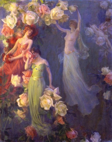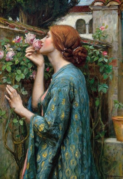 Gabriel von Max created "The Smell", sometime before his death in 1915. The painting invites us into a world where the senses intertwine, dominated by soft pink hues and the gentle curve of the subject's neck and shoulders. The composition is intimate; the woman is positioned so closely that her act of smelling the rose becomes almost tactile. Max masterfully uses light and shadow to sculpt form. Notice how the fabric drapes and clings to the woman's figure, creating a sense of depth and volume. The rose itself is a focal point, rendered with delicate brushstrokes that capture its velvety texture. In semiotic terms, we might read the rose as a signifier of beauty and sensuality, while the woman's upturned gaze suggests introspection. This is a painting that invites contemplation on the complex relationship between sensory experience and inner life. It is this interplay between surface appearance and symbolic depth that makes "The Smell" so compelling, reminding us that art's power lies in its ability to evoke not just visual pleasure but also intellectual and emotional engagement.