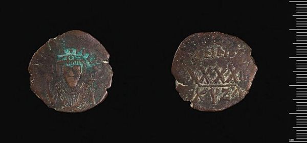 Curator: Here we have a coin, a rather humble object, actually. This particular one is called “Coin of Phokas.” Editor: It’s very small, almost easy to miss. And it has a dark, weathered look, which gives it a certain somber mood. Curator: Indeed. Phokas, whose image is pressed onto this copper alloy, ruled the Byzantine Empire briefly in the early 7th century. Notice the iconography, though—the cross he holds, the imperial robes. Editor: He’s presenting himself as a divine, chosen ruler, but it’s interesting to think about how power is negotiated and solidified through these objects, which were used in everyday transactions. Currency is propaganda! Curator: Of course. And it reveals so much about Byzantine ideology. The iconography reflects the empire’s intertwined relationship between church and state. Editor: Looking at this coin now, I’m reminded how even mundane objects can be powerful symbols and reflect grand narratives of their time. Curator: Yes, objects like this small coin echo through time, carrying the weight of empires and the quiet symbols of belief.