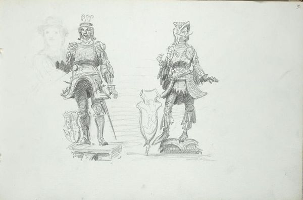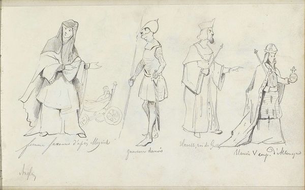 Friedrich Moosbrugger sketched this composition using graphite on paper. Here, the material’s inherent qualities of texture, and tone, imbue the artwork with a sense of immediacy, emphasizing the artist's process. The techniques employed – line work, shading, and composition – situate the artwork within a tradition of academic drawing, used for preparatory studies, or as a means of artistic exploration. The linear style captures the details of garments, from the fine suit on the left, to the armour in the middle, to the warrior's garb on the right, each suggesting different values, and classes. The amount of work involved in rendering each figure, shows a desire to show these societal differences. Paying attention to the materials and making of the drawing gives insight into Moosbrugger's understanding of societal classes, blurring the boundaries between fine art and social commentary.