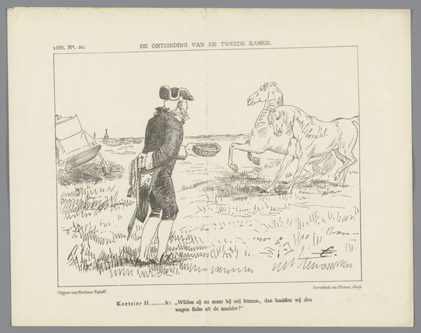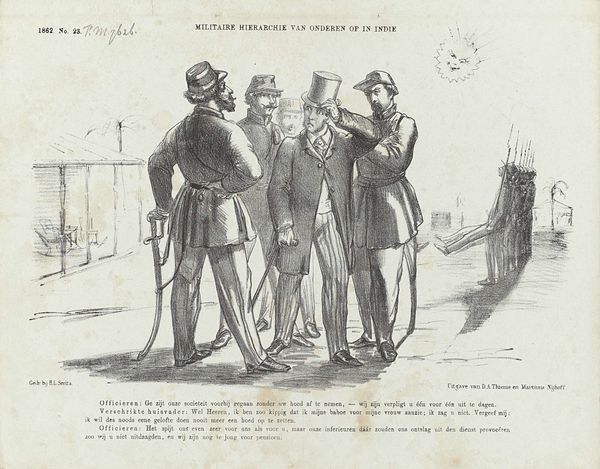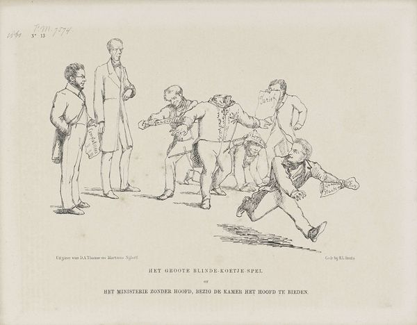 Editor: This is a drawing from 1866 by Johan Michaël Schmidt Crans called "Spotprent op de slechte toestand van de nationale defensie," which translates to "Cartoon on the Poor State of National Defence". It seems like a commentary on the military, rendered in a somewhat comical style with pen and ink. What story do you think this artwork is telling? Curator: This piece, while seemingly simple, is steeped in political and social critique. Consider the historical context: 1866. What major shifts were occurring in Europe? What emerging tensions might have impacted national defense strategies? Editor: I guess there were several wars brewing around this period in Europe, so maybe it’s pointing out that the Netherlands wasn’t really prepared for conflict? Curator: Precisely! The caricature style mocks the figures of authority, reducing them to these almost pathetic characters. Notice the body language, the expressions... how might those physical depictions speak to broader anxieties about national strength and identity? Where does the artist position blame? Editor: I see what you mean. The artist isn't just making fun, they're using humor to make a serious statement about governmental failure, it almost feels like calling out those in charge for their ineptitude. Curator: Exactly. Art like this serves as a vital historical document, giving us insight into the public sentiment. Political cartoons and caricatures often have the power to sway public opinion and encourage people to act. How might something like this have been received back in 1866, considering all of this? Editor: I imagine it was controversial! But probably it sparked discussions, or even fueled social change through satire. I’d never thought of cartoons this way before. Curator: Hopefully you'll remember from this context to also ask about current "fun" or "innocent" visual content too!