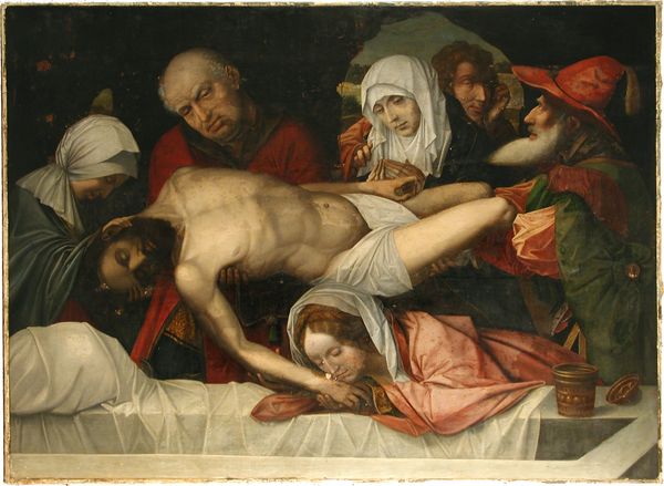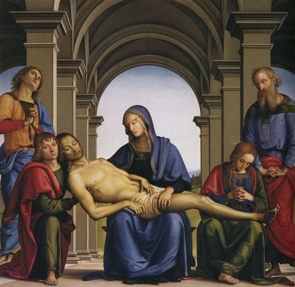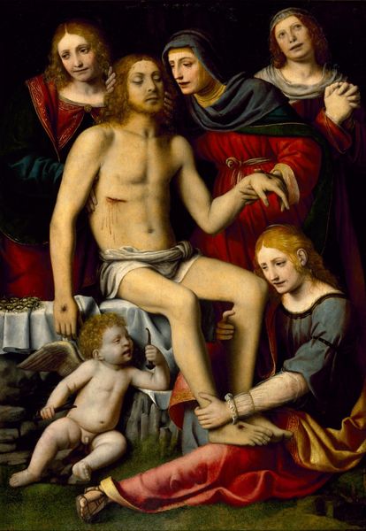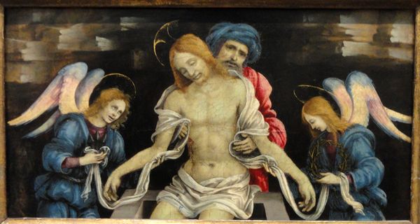 Curator: Looking at "Lamentation over the Body of Christ" by Gerard David, dating back to around 1500, the immediate feeling it evokes for me is one of somber, quiet resignation. The figures, set against a placid landscape, possess a gentle stillness in their grief. What's your take? Editor: Stark. I'm immediately drawn to the color. The contrast between the vivid reds and blues of the garments and the pale flesh of Christ creates an incredibly strong visual tension. The pyramidal composition, grounding the figures, forces us to acknowledge the heavy gravity of the scene. Curator: Precisely! David uses color to amplify emotion, but there's also a calming quality, almost serene, in the positioning of the figures within the broader landscape. You can almost feel the weight of sorrow they hold, mirrored by the symbolic weight of the composition itself. How does that interaction between figuration and setting resonate with you? Editor: I see a sophisticated employment of symbolism in the organization of forms and tonal scales: Mary’s blue robe symbolizes devotion, John’s red represents love and compassion, which frames the drama around the recumbent body in muted tonalities of pallor. It isn’t simply sorrow that we witness, but also complex and formalized human relations made legible through strategic use of visual codes. Curator: That reading clicks into my own impressions of the narrative's human core. Despite the intense grief, these figures embody a timeless dignity and stillness that is almost otherworldly, softened by the human elements of tenderness: Mary cradling Christ and the textures of loss registered across each face. It gives us this feeling of sorrow that is somehow bigger than just individual pain. Editor: That’s very insightful. Looking again, I notice the meticulously rendered textures of the clothing, the subtle gradations of color in the landscape and the geometry and balance they establish across this surface of symbolic import. Curator: Well, thinking about it, I believe "Lamentation" encapsulates the enduring themes of sorrow, empathy, and faith. It somehow blends the concrete pain of that moment with an almost hopeful outlook for salvation, all through color and placement, shape and tone, as you've highlighted. Editor: Indeed, reflecting upon the work’s historical context reveals how closely its stylistic conventions served the work’s ideological dimensions. Its skillful combination of established modes creates an experience which both comforts and stirs in its viewers.