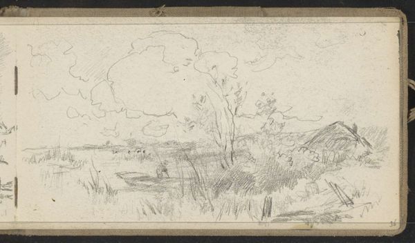 Editor: We’re looking at "Landschap met een boom," or "Landscape with a Tree," a pencil drawing by Jozef Israëls, dating roughly from 1834 to 1911. It’s currently housed at the Rijksmuseum. It feels very raw, just a quick impression of the landscape. What do you see in this piece? Curator: I see Israëls engaging with the landscape tradition, but through a lens of burgeoning realism and perhaps even proto-Impressionism. These types of sketches were made possible through easier portability of materials in the 19th century, which democratized art-making. The accessibility is reflected in this work, don’t you think? Editor: Definitely. It feels immediate and personal, not staged at all. Curator: Precisely. Think about the socio-political context. As the Dutch countryside modernized, artists like Israëls sought to capture its essence. But I'm interested in the function of these drawings. Was it practice? Could these drawings serve a different purpose beyond sketches? Editor: Maybe. It does lack a clear focal point or subject in a way that some studies don't. Perhaps it could have also been made simply as a souvenir of being at that location. Curator: A souvenir perhaps, a record? How might a modern audience interpret such seemingly "incomplete" work? What is its public role? Editor: Today, maybe its incompleteness becomes the point. It is less a polished presentation and more an authentic view of an individual and a landscape. Curator: Interesting! We’ve come a long way from formally staged landscape paintings and arrived at landscape as something almost incidental. Something of the here and now. Editor: Absolutely. Thinking about it as part of that progression gives me a new appreciation for what it represents. Curator: And I’m pondering its public accessibility! Thank you for the conversation.