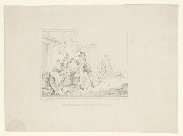 Curator: Here we have Pietro Testa's "The Holy Family with Attendant Angels," dating sometime between 1612 and 1650. It's rendered in ink on paper, an etching. Editor: The scene is delicate, almost ethereal. I’m curious about Testa’s choice to depict such a sacred scene with a seemingly simple method like etching. What does the medium contribute to the meaning? Curator: Consider the materiality of the etching process. The labour-intensive work, the precise control demanded by the needle on the plate, this physical engagement is interesting. It allowed for prints, multiples of this “holy” image, which moves it from unique art object to a reproducible commodity in seventeenth century Rome. Editor: So, you're saying that etching transformed a traditional religious scene into something that could be disseminated more widely? How does that alter our understanding of the image itself? Curator: Precisely. It democratizes the image, allowing wider access. Look at the varying line weights – some areas are delicately rendered, others are more emphatically etched. What does this unevenness suggest? Editor: Perhaps it reflects the different stages of the work, highlighting the artist's process. Was it common to view the making of art as important in this era? Curator: That’s insightful. Consider that prints such as this were often sold, moving from artist's studio to collectors, scholars, and even used in workshops. The etching becomes less about pure artistic skill and more about participating in a broader network of exchange and learning. Editor: That is definitely a fresh way to look at this! I will remember this idea of "democratizing the image" for my Art History class. Thank you. Curator: My pleasure! It’s crucial to understand how production methods shape our interpretations.