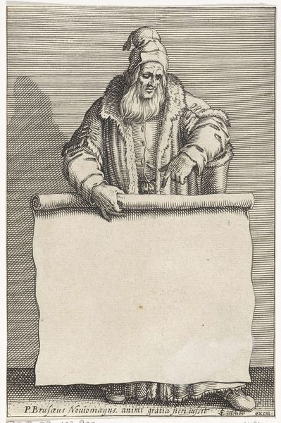 This engraving, by Pieter Serwouters, presents a man holding a blank scroll. The image was likely made by using a technique called etching. A metal plate would have been covered with a waxy, protective layer. The artist would then scratch away the wax to expose the metal, creating the image. The plate is then dipped in acid, which bites into the exposed metal, creating lines. The deeper the bite, the darker the line it will make in the final print. Ink is applied to the plate, filling the etched lines, and the surface is wiped clean. Finally, the plate is pressed onto a sheet of paper, transferring the ink and creating the print. The man's figure, clothes, and the way he holds the scroll speak to the cultural and social practices of the time, where literacy and the written word held immense power. The blank scroll becomes an open invitation, suggesting the potential for communication, knowledge, and perhaps even subversion. It reminds us that art is not just about the final image, but also the processes, skills, and cultural values that shaped its creation.