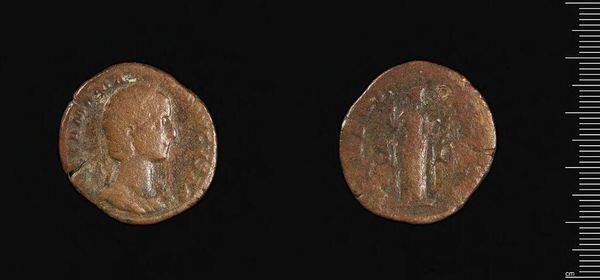 Curator: The Harvard Art Museums hold this sestertius, a bronze coin depicting Faustina II. Editor: It has a somber feel, doesn't it? The low relief and corrosion give it a ghostly quality. Curator: Indeed. Consider the labor invested in its production—mining the copper, striking the die. These processes were essential to Roman economic and social life. Editor: And consider how Faustina II is presented: her image, meant to evoke power, but now softened with age. What stories could this coin tell about the ideals of Roman womanhood? Curator: It also prompts reflections on trade routes and the dissemination of power. This one small object embodies vast networks. Editor: Yes, and how symbols endure even as empires crumble. Curator: A powerful reminder of the deep relationships between material and culture. Editor: Absolutely. It’s haunting to observe the echoes of a distant era.