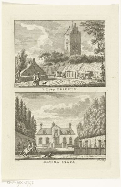 Curator: Here we have a print entitled 'Dorpsgezicht te Hitzum en gezicht op het dorp Boer', created between 1786 and 1792 by Carel Frederik Bendorp, currently held in the Rijksmuseum. It presents two distinct village scenes. What's your initial take? Editor: There's a quiet tranquility that emanates from both scenes. The crisp lines of the engraving lend a formality, but the arrangements of figures and buildings exude a sense of ordinary, daily life, doesn't it? Curator: It's fascinating how Bendorp uses engraving to capture the subtleties of rural life. We can examine the lines; each etched carefully into the copper plate to produce these images. Look closely at the upper panel, "Hitzum." Editor: Indeed. And observe the prevalence of particular cultural emblems, for example, notice how in both scenes the church spire forms a prominent vertical. It visually anchors the community to the sacred. Curator: Bendorp wasn't just representing villages; he was documenting the very fabric of rural 18th-century Dutch society. This process of engraving itself involved specialized workshops and a sophisticated system of production, highlighting a move away from unique objects towards replicable, distributable imagery. The market dynamics are palpable. Editor: The material reality shaped by society is clearly crucial, but I find my eye drawn to the archetypal motifs, too. Look at the placement of figures—always interacting, forming communities—in front of these specific structures such as the town church; the images create a shared history. I imagine the dog accompanying the figures along the causeway in "Boer" has specific cultural meanings as well, but I admit, I’ll have to do some research to be certain! Curator: True enough. Though those individual meanings matter, they become flattened in the production of something reproducible that will necessarily serve diverse audiences in myriad ways. Editor: You highlight that well. It truly does prompt one to think about cultural emblems, shared historical moments, the labor needed, and what those symbols might represent in 18th-century Netherlands. Curator: Exactly, and thanks to advancements in engraving technology, that experience can be democratized for audiences near and far, both then and now.