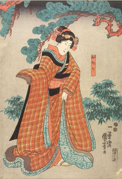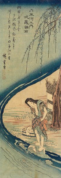 Curator: Hiroshige's "Famous Scenes of Edo in the Four Seasons: Sumida River in Snow" uses delicate lines to depict a serene winter scene. The woman in blue, along with the snow laden branches, and calm water is giving me such a peaceful impression! Editor: Absolutely! Let’s consider the historical context. Edo-period woodblock prints like this were produced for a broad audience; how does the commodification of landscape and leisure intersect with social class and gender here? Curator: It’s interesting to think about the printmaking process itself. The carving of the woodblocks, the application of ink and color, and the labor involved in producing multiples made it accessible. Editor: Indeed! The image participates in the construction of idealized femininity in a patriarchal society, framing the woman's role within certain social expectations. Curator: Her large umbrella, her clothing and stance also create such a strong horizontal composition and adds balance to the scene. Editor: The choice of subject, the Sumida River, also speaks to urbanization and the changing relationship between people and their environment. Curator: Thinking about the materials and the printing process offers such insight into how the artist was able to create such beautiful work for the masses. Editor: It’s important to remember that images like these both reflected and shaped the cultural landscape of their time.