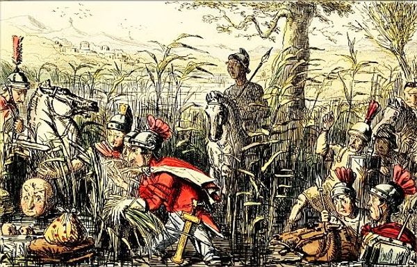 This fantastical scene, made by John Leech, presents a vivid tableau teeming with life and classical allusion. The composition is densely packed, drawing the eye across a landscape populated by both the mundane and the mythical. The juxtaposition of naturalistic rendering against the surreal animal headed figures creates a push and pull between the real and imagined. Leech destabilizes conventional narrative illustration by layering symbolic elements—a shepherd, a wolf-woman nursing infants, various animals—all set within an ambiguous pastoral setting. The image draws from the ancient Roman myth of Romulus and Remus, the founders of Rome, who were abandoned as babies and suckled by a she-wolf. Ultimately, the artwork prompts us to reconsider the relationships between nature and culture, reality and myth, challenging the viewer to decode the many symbolic registers at play. The detailed execution and intricate composition underscore the complex layering of meaning and artistic intention.