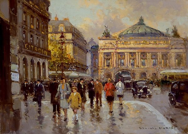 Edouard Cortes captured this lively scene of the Place de l'Opera with oil on canvas. Notice how Cortes arranges the composition: the Opera building sits slightly off-center, allowing the eye to travel along the street. The buildings on either side create a structured, almost theatrical frame. Cortes’s brushwork is loose and impressionistic, which destabilizes the fixity of form, reflecting a broader artistic shift towards capturing ephemeral moments rather than rigid representations. The colors, primarily muted browns and grays, evoke a sense of urban calm, punctuated by the warmer tones of streetlights. Semiotically, the Opera building represents high culture. The figures and vehicles populating the scene create a dynamic tension between permanence and transience. Each stroke is deliberate and contributes to the overall sense of fleeting urban life. The painting does not aim to present a definitive statement, but rather provides a momentary glimpse into the cultural and philosophical discourse of modern Paris.