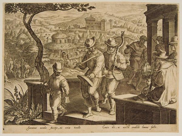 This print, "Jacht op merels," or "Hunting Blackbirds," was made by Philips Galle in the late 16th century. It's an engraving, which means the image was incised into a metal plate, probably copper, with a tool called a burin. Ink was then applied to the plate, forced into the grooves, and then the surface was wiped clean. Finally, paper was laid on the plate and run through a press, transferring the ink and creating the print. The act of engraving requires a great deal of skill and precision. The lines you see are carefully planned, and they build up to create tone and texture, and the overall impression of a nighttime hunting scene. Consider how the material qualities of the metal plate—its hardness and its capacity to hold a line—influence the final image. In a way, the printmaking process mirrors the hunt itself: just as the hunters in the image are using their skills and tools to capture birds, Galle used his own tools and techniques to capture a moment in time and convey it to a wider audience. This piece reflects a society where skilled labor and artistic craftsmanship were valued, yet also one where such skills could be put in the service of leisure pursuits. Examining materials and making helps us to understand its historical and social context more deeply.