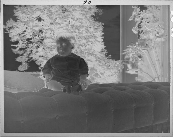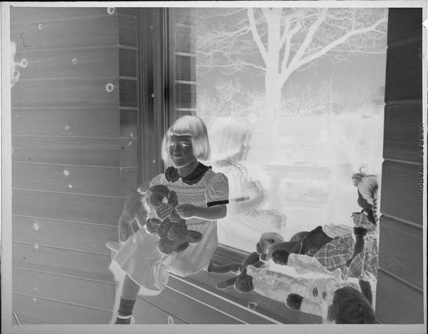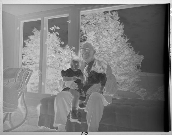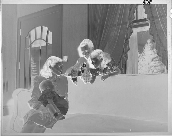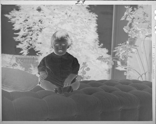 Curator: This photograph, of unknown date, by Lucian and Mary Brown is called "Untitled (two girls on couch in front of window)." Editor: It has an unnerving quality; the reversal of light and shadow gives the children an almost spectral appearance. Curator: Absolutely. The photograph's medium, a reversed photographic negative, speaks to experimentation in early photographic processes and the artistic license afforded by the Browns' studio. Editor: The girls themselves, positioned on the plush couch, almost seem to be mirroring one another, emphasizing a shared innocence, but also a strange doubling, reminiscent of childhood games and make-believe. Curator: The presence of the window, framing the girls against the natural world, introduces a layer of socio-cultural context, perhaps symbolizing the transition from domesticity to the broader world awaiting them. Editor: The mirroring, the contrast, it all points to the duality of childhood, innocence, and the unknown, it's quite compelling! Curator: Indeed, it captures a moment rich with historical and cultural overtones.