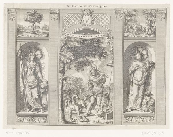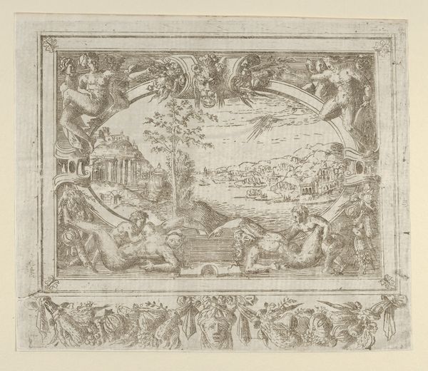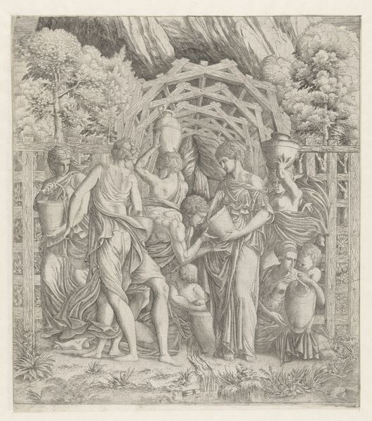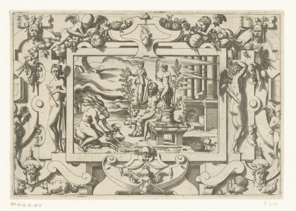 Curator: The initial impression is striking, almost unsettling in its hyper-detailed yet ethereal landscape. It reminds me of old anatomical drawings—scientifically observed but creatively rendered. Editor: Indeed! We are looking at “The Creation of Eve," a drawing in ink, dating back to before 1545. It is currently housed in the Rijksmuseum. What is particularly remarkable is how Jean Mignon marries fine linework with such an expansive vision of a symbolic landscape. Curator: The level of craft is outstanding. It makes me think about Mignon’s workshop: who assisted him? What kind of tools did they have access to? How were such detailed prints disseminated, and what was their value as tradeable objects in the Renaissance market? Editor: Absolutely! The piece's layered significance is something to behold: it places biblical narrative firmly within the aesthetic and intellectual currents of its time. It's about identity, about origin, and about how gender roles were being codified and questioned. Look at Eve's active gesture versus Adam’s almost inert form. The drawing makes a distinct claim about who holds the agency. Curator: I think that Mignon utilized ink and line not only to represent, but also to participate in larger societal discourses, maybe unconsciously, through available resources, techniques, workshop practices, or distribution channels. Editor: And the setting within the frame also invites exploration. Its very presence challenges the viewer to place the work within various layers of cultural contexts. Were this artwork received differently by women viewers versus men, how might access be policed depending on class, religion, or familial structures? Curator: Considering labor again, look at the varying line weights, it's possible to hypothesize the use of differing styluses or perhaps even the hands of various workers within Mignon’s studio who translated the master's designs into physical realities, making the production almost collaborative. Editor: Precisely. Examining these questions is key to unveiling a nuanced understanding of "The Creation of Eve"—it provides an illuminating lens through which we can assess historical narratives about agency, faith, and power. Curator: Analyzing this drawing gives great insights into the means through which religious iconography gets translated into popular imagery by Northern Renaissance studios for local elites. Editor: Agreed, by studying artworks through intersectional prisms and acknowledging its place as a confluence of social, artistic, and historical currents, one gains a more intricate perspective into works of the past.