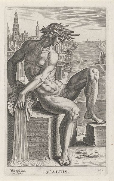 Philips Galle’s engraving depicts the river god Rodanus, a classical personification of the Rhône. The reclining male figure adorned with a wreath of foliage embodies the life-giving force of the river, a tradition stretching back to antiquity. Here, Rodanus rests upon a plinth, his foot atop a waterspout emerging from a shell. This motif—the river god—echoes across millennia, from ancient Roman sculptures to Renaissance fountains. Consider, for instance, how similar figures were deployed in grand public works to evoke the power and beneficence of nature, connecting civic pride with the primal forces of the earth. The flowing water, a symbol of constant renewal, speaks to the cyclical nature of life itself, a concept deeply rooted in the human psyche. Note how the pose, relaxed yet powerful, conveys both the serenity and latent energy of the river. Observe how the image captures a moment of tranquil strength. The enduring appeal of this symbol lies in its ability to tap into our collective memory, reminding us of the elemental forces that shape our world.
