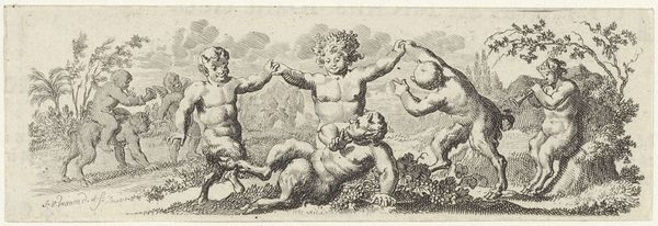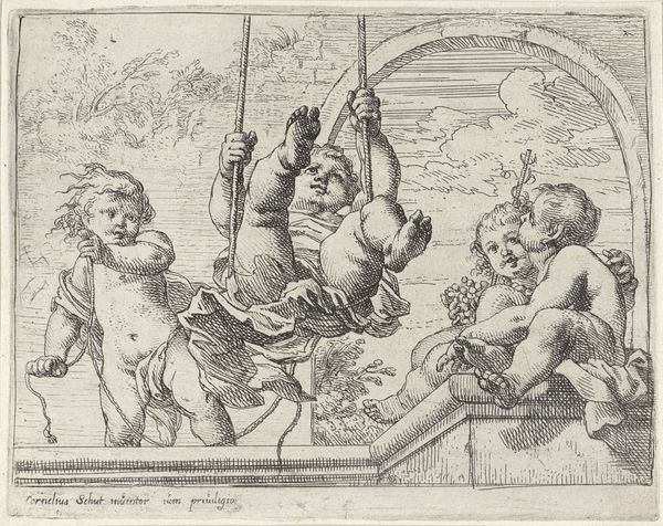 Cornelis Schut created this etching titled 'Fries met acht bacchanten' - or 'Frieze with eight Bacchants' - during the Dutch Golden Age, a period of immense cultural and economic prosperity for the Netherlands. The etching depicts eight putti, or 'bacchanten' – winged figures, often associated with love, lust and fertility. They are playfully engaging in what seems like a Bacchic revelry; a celebration of wine and pleasure associated with the Roman god Bacchus. These figures were not merely decorative; they were potent symbols that reflected the era's complex relationship with pleasure, excess, and the classical past. Looking closely, we see these aren't just any children; they’re chubby, active, and unreserved. Their nakedness and activity defy the strictures of conventional morality. This challenges the rigid social norms of the time. The print becomes a subtle rebellion, a space where pleasure and freedom take center stage, even if just for a moment. The Dutch Golden Age was not just about wealth and art, but also about navigating the tensions between tradition and modernity. Schut's etching provides a glimpse into that world, where societal boundaries were tested and the celebration of life's simple pleasures was elevated.