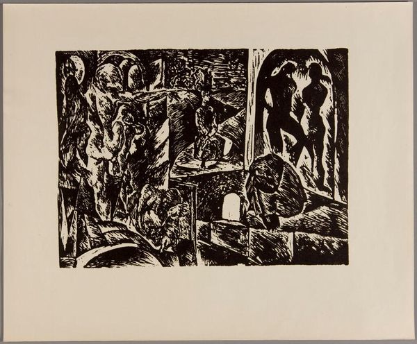 Lucien Pissarro created "Daphnis et Chloe," a wood engraving that uses stark contrasts to render an idyllic scene with figures in a landscape. The composition is densely packed, with figures emerging from a dark background, illuminated by torches. The artist’s use of hatching and cross-hatching creates a rich surface texture, emphasizing the materiality of the woodblock. This textural complexity infuses a sense of depth and movement to the scene. The stark contrast between light and shadow isn’t merely descriptive; it’s a structural device. Pissarro employs it to guide the viewer's eye, creating focal points and shaping the narrative flow. The composition suggests a tension between the classical subject matter and the modern approach to form, inviting us to consider how traditional themes can be reimagined through innovative techniques. Pissarro challenges fixed ideas about pastoral imagery.