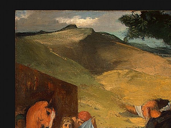 Curator: I see a flurry of earth tones. The ochre and russet shades lend a feeling of baked earth, immediately making me think of sun-drenched afternoons in some bygone Mediterranean locale. It's both captivating and, strangely, melancholic. Editor: Precisely. This detail is taken from Edgar Degas’s "Alexander and Bucephalus," completed in 1861. It’s an oil painting, and embodies the academic style—evident in its careful composition and focus on historical narrative. Curator: You know, "academic" always feels like such a sterile term. Look at how those figures in the background dissolve into the landscape! The tension between precision and looseness...it feels so human. So very, very Degas! Editor: True. We observe here an early engagement with movement and light. Semiotically, consider the obscured cityscape. It isn't about glorifying Alexander's conquest but about embedding the hero within the fleeting nature of time. Curator: He always was interested in things beyond traditional art back then. Did he maybe sense even this glorious moment in history was just…a blink? You know? Look, maybe he couldn’t have foreseen how it would impact everyone, but he had a deep personal need to get all this down as rawly and purely as possible—the feeling in the figures and horses is incredible. Editor: Degas constructs his painting with layering, contrasting light with shadows to give mass. We get a glimpse of something new from what others see as traditional, such as history or conquest paintings. Curator: I suppose it invites me to think, what details am I overlooking today, what quiet beauty might be escaping my notice, or maybe which people am I overlooking. Degas had his concerns back then, so do I now. Thanks for your careful way of seeing today. Editor: Yes, thanks for expressing those feelings. The detail reminds us that Degas’s works, in essence, ask the observer to reconcile past narratives with current sensations.