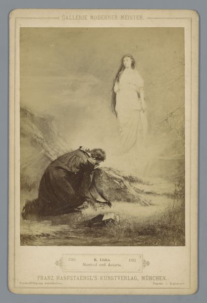 Curator: We're looking at a photographic reproduction of a painting from the Rijksmuseum collection. It dates to the 1850s or 1860s and features an unknown woman leaning on a balustrade. Editor: There's a wistful air about it. The soft sepia tones lend it an antique quality, almost as if we are peering into a half-forgotten dream. Curator: It really evokes the Romantic spirit, doesn’t it? These images often perpetuated ideals about women's roles and emotionality in the 19th century, creating almost performative personas. The figure looks upward and away. It's fascinating to consider how staged such ‘candid’ poses truly were. Editor: I’m drawn to the subtle details; notice the climbing foliage. Plants entwined on a balustrade often suggest the themes of growth, connection to nature and also perhaps a hint of enclosure. The photograph acts as a kind of time capsule in capturing the prevailing moods and hidden languages. Curator: Precisely, but this “hidden language” operates under very strict conventions, encoding gender expectations into what appears natural. How did posing become political? Why was yearning such an essential feminine posture? I would be very curious to understand the context of this photograph – what statement did it attempt to make, and whom did it attempt to serve? Editor: True, such art never exists in a vacuum. Still, one can enjoy the layers of history woven into such an image. We have the reproduced image of an oil painting, the skill and artistry that involved and that in itself shows us the aesthetic appeal of those times. It makes you ponder the evolution of photographic media too. Curator: Exactly. It shows us how certain styles of image-making persisted through the technical invention, how the same gestures and moods migrate across media... interesting. Editor: Indeed! Well, I found that to be an engaging conversation! Curator: Me too, it helped me to connect it with aspects that weren't clear initially. Thank you!