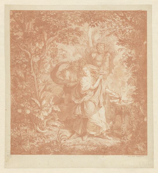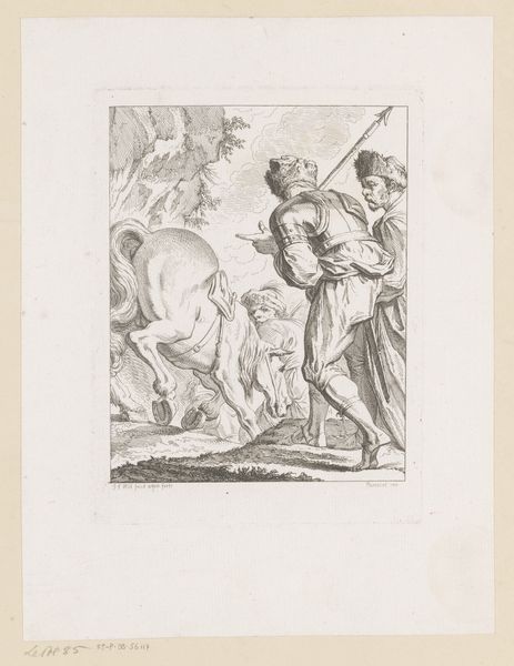 "Vlucht naar Egypte," or "Flight into Egypt," is an etching made by Claude Henri Watelet in the 18th century. During this period, France experienced significant social change, with Enlightenment ideals influencing artistic expression. Here, we see the depiction of Mary and Jesus escaping into Egypt. Mary is riding on a donkey, guided by Joseph. They are rendered in a style that evokes vulnerability. The choice to represent this particular biblical scene during the Enlightenment, a time of questioning traditional beliefs, opens up interesting questions about the role of religion, motherhood, and refuge. The image allows for an emotional connection with the figures. It invites us to reflect on themes of displacement, protection, and the search for safety, which resonate across different cultures. Ultimately, this piece encourages us to consider the historical and social context in which it was created while inviting an emotional and personal engagement with its subjects.