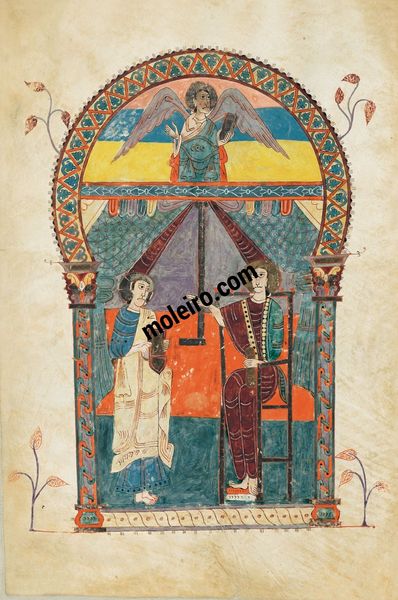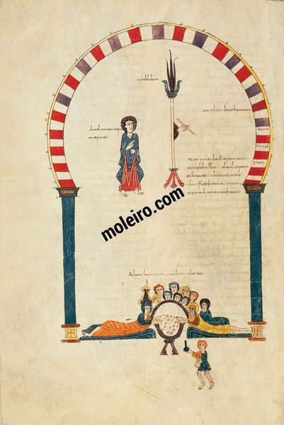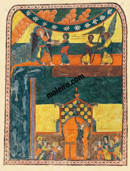 Curator: Right now, we're looking at "The Fire of Babylon and the Mourning of the Kings and Merchants." Created around the year 975 by the artist Ende, it's a tempera on parchment, alive with color and intricate detail. My initial thought? There's such raw vulnerability here. Like a children's book about the end of the world. Editor: A fascinating mix of Byzantine and Islamic artistic influences, immediately felt, almost palpable. The walled city, ablaze and cascading upwards is such a rigid form, contrasted by the emotional weeping of the merchants and kings. The artist here shows us devastation as spectacle and personal sorrow as a performative rite. Curator: Oh, the artist Ende certainly invites that, doesn’t she? To dive deep. You said rigid. I keep looking at that burning city and it seems anything BUT rigid. There’s an almost playful quality to the towers, a joyful chaos. What draws me are those repeating geometric patterns that soften the blow of it all. It feels strangely comforting. The world can end, yes, but isn’t it gorgeous on the way down? Editor: Gorgeous maybe isn’t quite the word that springs to mind... however. The repetitive geometric patterns are indeed intriguing because Babylon—notorious for its opulence—here turns into patterns and architectural motifs which speak to Islamic art. The towers feel more akin to Moorish designs than a biblical firestorm, hinting, perhaps, that Babylon was once grand in reality and has since devolved into legend. Ende, our 10th century artist is hinting at loss and misremembered histories, with those Islamic images offering as something both beautiful and melancholic. Curator: Mmm. Lost beauty indeed, and perhaps more timely than ever. Ende’s emotional depth reminds us, almost screams at us, that devastation never appears solely as ashes and destruction. It’s this odd tango of the magnificent with the mournful, no? This illustration doesn't only depict history but the deep pang of loss felt when glory fades. I mean, empires come and empires go, right? Maybe this illuminated painting is a poignant warning about how beautiful the world could become, if empires fell everyday… a day dream of a beautiful end. Editor: Indeed. The emotional power of loss made real; this illumination offers both lament and lingering admiration for what was, leaving us with echoes and afterimages of Babylon's majestic yet fiery fate. Curator: Ultimately, maybe a gentle, fiery prompt for a bit of reflection? A reminder, etched in color and pain, to notice, remember, and mourn, the ephemeral beauty of life.