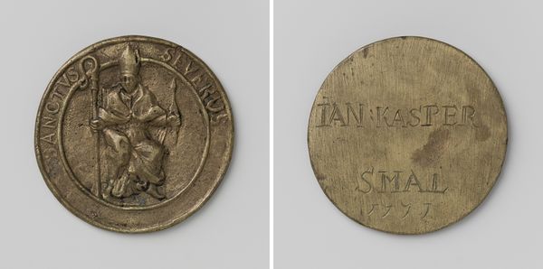 Curator: Here we have a bronze commemorative medal, dating back to 1764, created by B.W. Meusies. The title is rather descriptive: "Burgerweeshuis te Amsterdam," which translates to the Amsterdam Orphanage. Editor: It's such a tangible piece of history, isn’t it? I am immediately struck by the contrast. The orphanage sounds somber, but the medal feels like it wants to celebrate or commemorate something. The style, the color of the metal, it's hard not to be a little charmed. Curator: That contrast is crucial. Institutions often commissioned such objects to broadcast an image of benevolent power. Look closely—on one side, we see two figures flanking a coat of arms surmounted by a large crown. Editor: Yes, there's a real formality to the figures flanking the coat of arms—they present the institution as respectable. But there is more to this piece, right? The other side provides more context. Curator: Exactly. Inscribed around the perimeter, the Dutch text reads “Teken aan de Burgerweeskinderen van Amsterdam”, or “Token for the Orphan Children of Amsterdam”. Inside this border are the artist’s initials “B W”, the family name “Meusies”, and the year it was cast: 1764. Editor: So these medals were more than just decorative or commemorative items; they had a purpose. How do you think the recipients experienced it? Curator: Knowing these were likely distributed to orphans gives us a whole other avenue of examination. Were they a mark of pride? A subtle reminder of dependency? Were these merely ceremonial? I cannot answer these, of course, but the artifact brings these to light. Editor: It's that tension – the blend of institutional power and personal experience – that I find so powerful. This piece allows us to think about both simultaneously. Thanks to Meusies’ eye for the fine line, the kids were granted something both celebratory and deeply melancholic. Curator: It gives a focus point on institutions that had to step up for vulnerable children. These medallions create a dialogue between history and current care for such institutions, encouraging conversation and critical thinking.