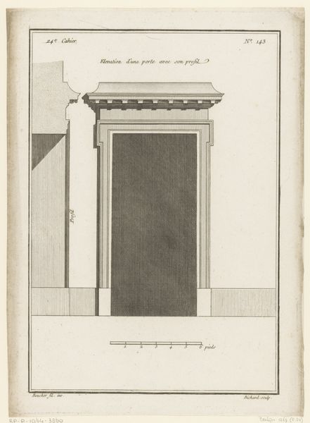 Curator: Here at the Rijksmuseum, we're looking at Jean-Baptiste Bichard's print, "Poort met guirlandes," made between 1772 and 1779. It's an etching and engraving of a doorway design. My first impression is one of measured formality. It's austere but the floral garland softens the design somewhat. What stands out for you? Editor: Curator:The meticulous linework, for me, speaks volumes about the era's manufacturing processes. The level of detail achievable through etching and engraving—it reveals the skilled labor that went into these designs. Consider the societal value placed on this craft! It contrasts so sharply with today's mass-produced items. Curator: Certainly! And Bichard employs neoclassicism— the imagery consciously evokes earlier artistic ideals, echoing Greek and Roman motifs. The garlands themselves often represented celebration, joy, and perhaps most importantly, accomplishment in ancient art. Editor: Do you think the print served purely as a functional architectural document, or was there a desire to elevate the craft, too? You can almost feel the negotiation between functionality and display in the design process. Also the materials. This kind of art piece will likely require high-quality materials Curator: I believe there's an aspirational element. Presenting architecture this way imbues it with a kind of timeless quality. Note the geometric regularity - a concept resonating with Enlightenment values of order and reason, with each detail hinting to stories of tradition. It signifies, if nothing else, an attempt to control nature. Editor: I agree completely. I wonder though if there’s commentary being offered on the increasing homogenization of aesthetic values for architecture and design during this period. Does Bichard adopt, resist or complicate those norms through his creative treatment and utilization of craft techniques? Curator: It's a very good point, how he navigated those conflicting ideals. Viewing the garland as a cultural symbol allows us to look into that tension - the traditional with emerging aesthetic sensibilities. Editor: The combination is, to say the least, quite interesting. It feels like one of the last moments when the hand of the craftsman was so evident. We should definitely explore that further sometime. Curator: I'd like that very much. Perhaps our visitors might consider what doors mean to them symbolically in the context of Bichard's work. What possibilities they represent, what transitions.