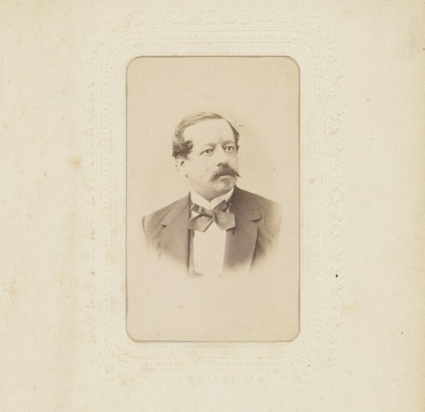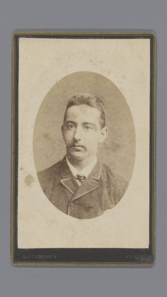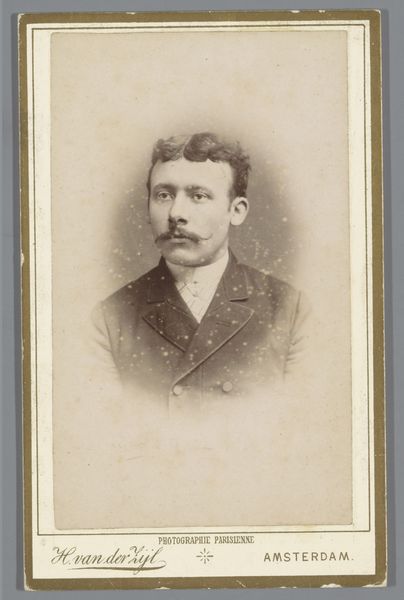 This is Wilhelm Küpper's portrait of a moustached man, possibly Edouard Donker. The photographic print, encased in a simple card mount, presents a study in tonal contrasts and controlled composition. The oval vignette focuses our attention on the subject's face, framed by the dark fur collar. The photograph’s structure offers an interesting interplay between the softness of the sepia tones and the crisp lines of the man's jacket and meticulously groomed moustache. The composition, bisected horizontally by the moustache, creates two distinct zones: the expressive upper face and the formal attire below. This division highlights a tension between individual character and social presentation. Note how Küpper uses the albumen print to capture the details of texture, from the fur’s plushness to the subtle gradations of light on the face, transforming a simple portrait into a semiotic exercise exploring identity, representation, and the cultural codes of masculinity in the 19th century.