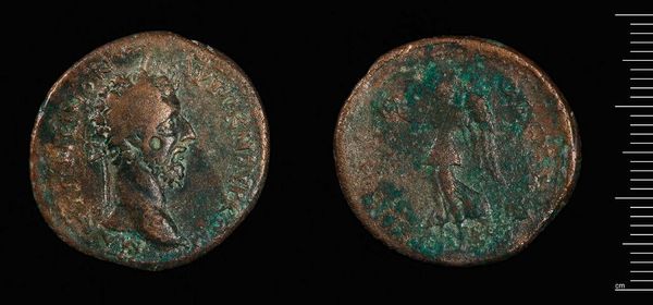 Curator: This is a sestertius, a Roman coin, bearing the image of Emperor Trajan Decius. Its bronze surface is marked by time, yet it offers a glimpse into the visual language of power. Editor: The patina evokes such a sense of age, doesn’t it? It feels like holding a piece of history worn smooth by centuries of handling and exchange. Curator: Indeed. The coin’s imagery served as propaganda, circulating the emperor’s likeness and projecting Roman ideals throughout the empire. Editor: I see a figure on the reverse side—possibly a deity? Coins were often miniature stages for expressing cultural values and aspirations. Curator: Precisely. This particular imagery can tell us about the values Trajan Decius sought to embody, and how he wished to be remembered by the populace. Editor: It's fascinating to think how a small object like this could shape perceptions of leadership and empire across vast distances and generations. Curator: Ultimately, this coin acts as a vital artifact, revealing how power was visualized and disseminated within Roman society. Editor: Yes, and it demonstrates the remarkable potency of symbolic imagery to convey meaning, even millennia later.
