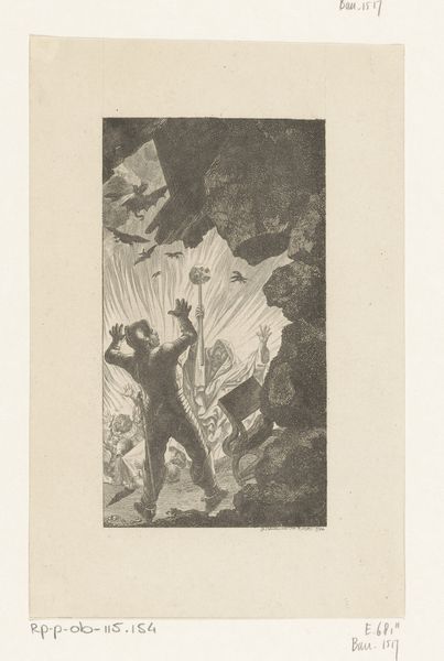 Editor: Here we have Marcel Roux's 1910 print, an etching in ink on paper titled "Spiderweb with anthropomorphic spider capturing a man". It's immediately striking – unsettling, even, with that nightmarish scene rendered in stark black and white. The detail is incredible. What do you see in this piece? Curator: It speaks of primal fears, doesn't it? That age-old dread of the unknown, the lurking predator. I find myself pondering the symbolism; the spider, often a feminine archetype, here traps the masculine. A Freudian feast, perhaps? Do you feel the composition amplifies the tension? That web isn't just a trap; it's a cage of anxieties, drawn with incredible confidence using those stark contrasts of light and dark, a signature move within symbolism. Editor: Definitely. It’s like a visual metaphor for entrapment, almost suffocating. It does have this undercurrent of the erotic... I mean, it makes me deeply uncomfortable, yet there is something fascinating at the same time. Curator: It’s a beautiful, terrifying dance, isn't it? Remember, symbolism relished exploring the darker corners of the human psyche, the repressed desires, and anxieties. Consider how the very *process* of etching - the biting of the acid into the plate - mirrors the spider’s venomous bite, slowly claiming its prey. The question I always come back to with pieces like this... where does the spider’s power truly lie – in its physical prowess, or in its ability to manipulate fear? Editor: That’s a fantastic point! I hadn't thought about the process of etching mirroring the spider's venom, it changes my appreciation. It's a visual story that goes well beyond a literal image of capture. Curator: Absolutely. It resonates within your imagination, burrowing deep like a… well, like a spider in its web. Editor: Very true! I'll be seeing spiders a little differently for a while. Curator: Me too. Art has that transformative magic, doesn't it? To alter our perception of the world.
