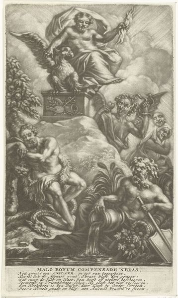 Editor: We're looking at Jacob Matham’s “Amor en Psyche” from 1607, currently housed at the Rijksmuseum. It’s an engraving, so everything is rendered in incredibly fine lines. My first thought is, it’s so dreamy. It almost feels like a secret glimpse into another world. All of these chubby cherubs flitting about... How do you interpret this work? Curator: It's a luscious rendering of the classical myth, isn't it? The swirling Baroque dynamism meets a Renaissance love for allegory... but to me, the *real* story is in the hatching, all those delicate lines building tone and form. Matham makes the whole scene shimmer, like catching a stolen kiss. Does that make sense? It's a dance of light and shadow that breathes life into these mythological figures. I'm just imagining Matham at his bench, eyes magnified, completely engrossed in this task. It’s so dedicated. Editor: Definitely, the details are incredible! All those fine lines do create a sense of depth. Do you think the choice of making it an engraving gives it a certain feel compared to, say, a painting? Curator: Absolutely. Engraving, unlike painting, demands meticulous planning and execution. Every mark is deliberate. It’s almost like writing code, wouldn’t you say? The constraint breeds ingenuity, and here, Matham transmutes the mythological to the wonderfully tangible and intimate. The figures *become* of the lines... they're nothing without them! Which do you think best embodies the dream-like nature, Psyche, Amor, or some other figure? Editor: That's a great point about the deliberate mark-making. I'm going to have to say the little cherub at the bottom, tugging on the sheets—he makes the scene come alive! This piece really reveals the depth achievable through the printmaking process. Curator: Precisely. Seeing those little touches is exactly how we experience history today! Thank you!