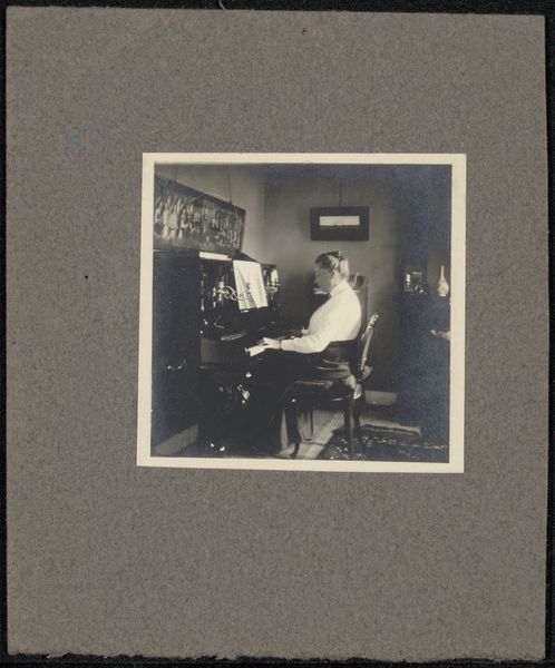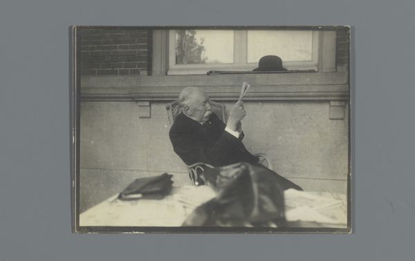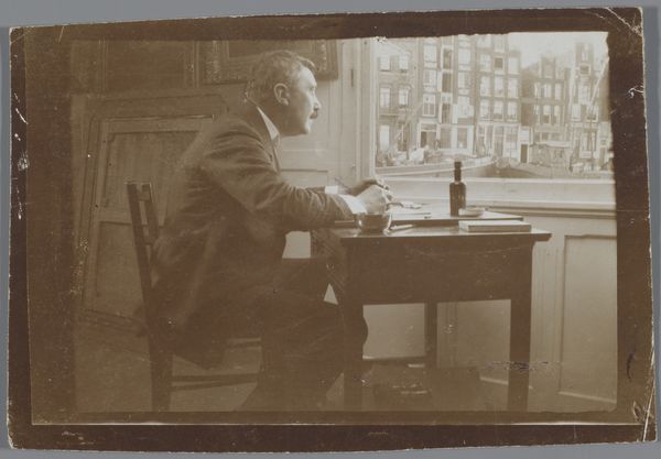 Editor: Here we have a gelatin silver print from sometime between 1930 and 1935, titled "Meinard Dorus Mijer aan een tafel" – so, "at a table" – and the artist is anonymous. There’s a studious mood to this portrait. What can you tell me about it? Curator: The beauty of photography lies in its apparent objectivity. But this image, especially considered through a critical lens, prompts questions. What does it mean to present a man, presumably of some stature given the setting, amidst signs of domesticity and perhaps even leisure? Who gets to occupy these spaces, to be depicted in such a manner, and who is excluded? Editor: It’s interesting you focus on space. He does seem very comfortable in the composition. How does that tie into a broader historical context? Curator: Consider the period. This was a time of growing political polarization, with increasing anxieties around class, race, and national identity. Photography, as a relatively new medium, was often employed to solidify these categories – think of mugshots, anthropological documentation. How might this portrait, by focusing on bourgeois respectability, subtly reinforce certain social hierarchies? Editor: So, it’s not just a simple portrait; it is subtly commenting on or upholding a certain order. What do you make of the staging—the screen behind him, for example? Curator: Precisely. And these elements aren’t accidental. The screen, the patterned tablecloth, these objects signify a particular level of privilege and cultural capital. We have to question what work this "realism" is doing. Editor: This makes me think about how portraiture, even in photography, isn't a neutral act. The choices of composition and setting say as much as the subject themselves. Curator: Absolutely. It’s a reminder that every image is a carefully constructed argument, inviting us to question what power dynamics it embodies or obscures. Considering it like this is crucial to a more nuanced understanding.