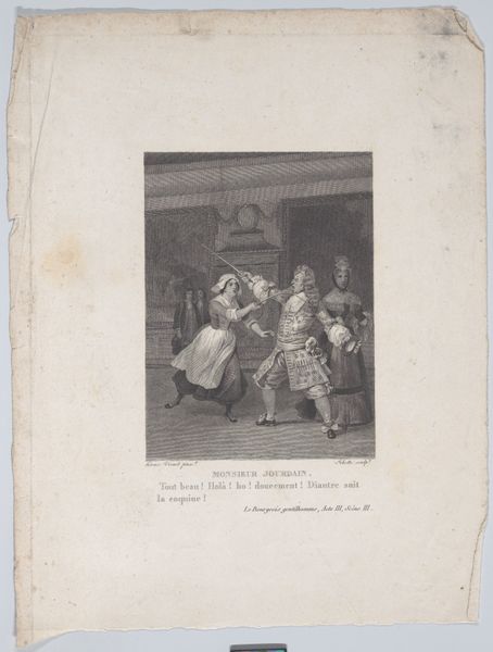 Editor: This print by Jean-Baptiste-Blaise Simonet, titled "Interior with woman between two men, her hand raised", made around 1811-1813, depicts a rather theatrical scene. The woman’s raised hand and the men's stances suggest a moment of heightened tension or perhaps a moral dilemma. What layers might we be missing in this seemingly simple composition? Curator: This image offers us a window into early 19th-century Neoclassical concerns regarding gender and power dynamics. The woman, positioned centrally but seemingly constrained by the men, could represent the limited agency afforded to women within a patriarchal society. The "raised hand" is especially intriguing. Is it a gesture of defiance? Or supplication? We should ask, how does the staging, reminiscent of theater, reinforce or subvert the established norms of the time? Editor: So, it's less about the literal story being portrayed and more about what it reveals about social structures? The print appears to use history to reflect ideas back to its present. Curator: Exactly. Academic art often aimed to teach moral lessons and uphold societal values, but we can also analyze it critically, noting how it might expose inherent inequalities. The "woman between two men" is an ancient trope - a symbol of difficult decisionmaking - but also can show us how very limited the scope was for many women. What are they disagreeing over? Power? Love? Status? Who benefits from the argument being undertaken in the space? Editor: I see, considering it in the context of early 19th-century societal norms makes the image far more compelling. I never would have gone that far if left to my own thoughts. Curator: Considering art within a historical and social frame illuminates not just the past, but also the continuous renegotiations of power and identity that persist today. Editor: Thanks so much for your insights; I’m starting to appreciate academic prints as less passive records.