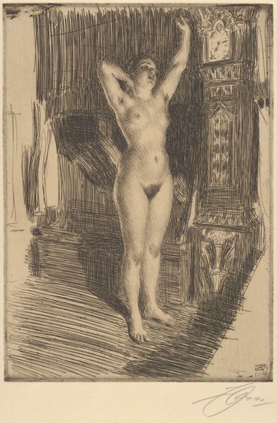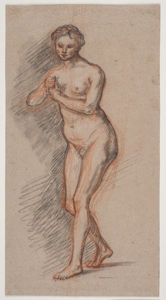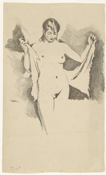 Editor: This is Johan Antonie de Jonge's "Standing Female Nude," dating from 1874 to 1927, rendered with what appears to be graphite and pencil on paper. It feels almost classical in its pose, but something about the unfinished elements, like the sketched-in hand hovering above, gives it a very modern feel. What catches your eye about it? Curator: Ah, yes. I think what strikes me most is its intimacy, doesn't it you? It feels as if we are glimpsing a private moment, a figure caught between poses, still forming in the artist's mind – or maybe our own. It feels intensely human and immediate, even though it's over a century old! Do you notice how the deep shading on one side contrasts with the open, lighter area? Editor: Yes, it's almost theatrical lighting! It really accentuates her form, doesn't it? The shadows seem to suggest both a physical space and, perhaps, an internal one. Curator: Precisely! And notice the economy of line. De Jonge doesn't belabor the details. Each mark feels deliberate, capturing the essence of form and light. I think it really speaks to the power of suggestion in art - leaving space for our imagination to wander, like a whispered secret, dont you think? Almost like a conversation, it feels quite raw. Editor: That’s beautiful, the idea of a whispered secret. The “unfinished” bits definitely contribute to that feeling. I initially thought of them as just unfinished, but I can see how they invite us in. Curator: Right! What’s more captivating than the barely-there? Think about dreams – are they ever fully formed? This feels akin. Thank you for helping me appreciate it on a new level! Editor: Thanks, I now know that these drawings tell just as much a story, even though they are subtle. It's been fascinating seeing this with you.