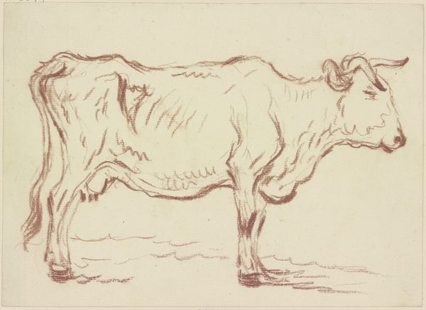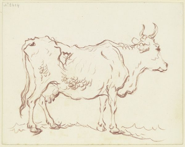 Curator: Here we have "Standing cow to the left," a pencil drawing housed here at the Städel Museum, by Friedrich Wilhelm Hirt. Editor: My first thought is of simplicity; it's like a fleeting glimpse of rural life captured with such delicate lines. The texture created by the pencil almost makes me feel the rough hide of the cow. Curator: Yes, Hirt's rendering indeed invites us to appreciate rural simplicity, but it is essential to look at the artistic conventions and power structures implicit within this representation of the agrarian. Editor: You’re right, it is worth questioning. Does the seeming simplicity mask a deeper idealization of rural life, a perspective that potentially glosses over the lived realities of those connected to the land? Curator: Exactly! During Hirt’s era, the prevailing societal views heavily influenced such artistic portrayals. One must ask who the image serves: does it represent a sincere depiction, or perpetuate a romanticized, perhaps even exploitative, view of agriculture and its workers? Editor: It makes me wonder about access too. Images like these—even simple sketches—circulated within particular social strata. What about the stories and lived experiences absent from the frame? Whose perspectives are valorized versus silenced? Curator: These works provided a sense of grounding to an urbanizing elite. So while on the surface, it's a simple pastoral image, under examination it illustrates larger economic, social and cultural narratives of its time. The question is always, what does it tell us about the power of representation, then and now? Editor: Thinking about that tension—between simple beauty and embedded social narratives—gives me so much to consider moving forward, every mark on the paper. Curator: For me, it reaffirms that to appreciate this drawing fully we should look into the power dynamics embedded in our aesthetic choices and social systems that elevated the landscape genre during his time.
