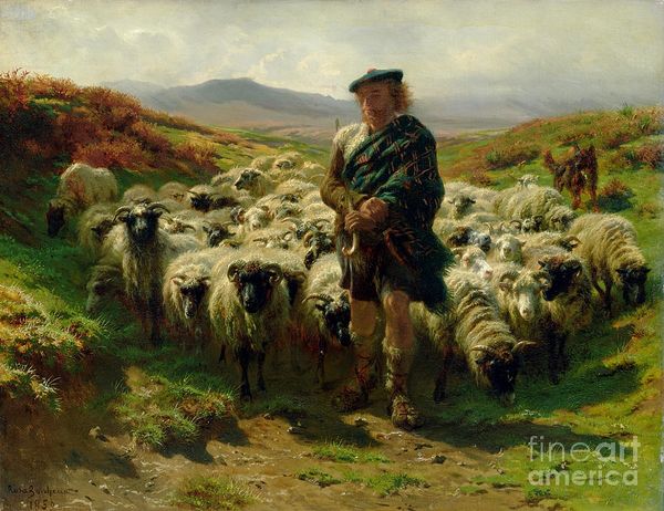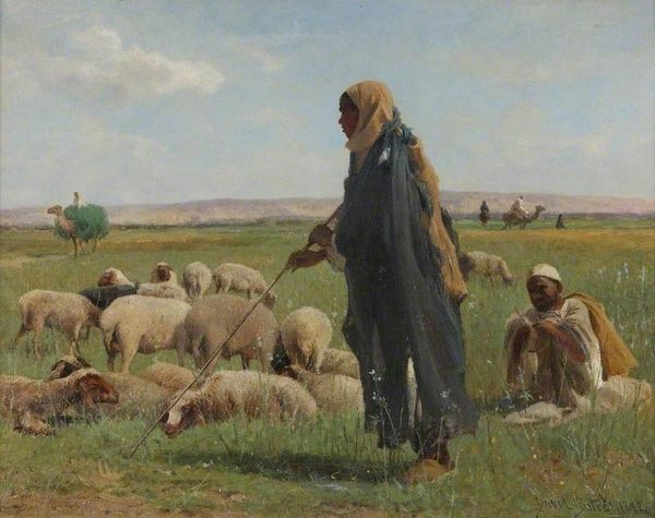 Charles Sprague Pearce crafted "Le Retour du Troupeau" using oil on canvas, rendering a pastoral scene that balances tranquility with structural rigidity. At first glance, the composition draws you in with its muted palette, dominated by earth tones and soft greys, creating a subdued, almost melancholic atmosphere. Pearce’s structural approach divides the canvas into distinct zones: the foreground with the shepherdess and her flock, the middle ground with the sheep pen, and the distant, blurred horizon. The texture varies from the smooth, almost polished faces of the sheep to the rough, tactile brushstrokes defining the shepherdess's cloak. This division isn't merely representational. It suggests a carefully constructed narrative, a semiotic system where each element—the gate, the dog, the girl's gaze—contributes to a larger commentary on rural life and perhaps the artist's philosophical musings on man's place within nature. Pearce challenges simple, bucolic interpretations by infusing the scene with subtle tension, a visual echo of broader cultural anxieties concerning modernity and tradition.