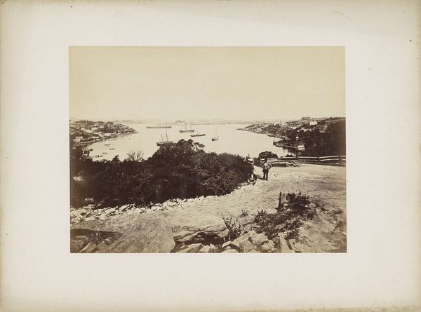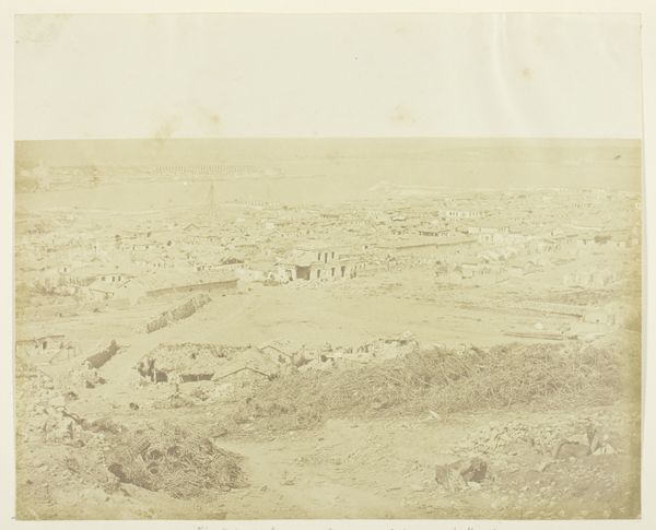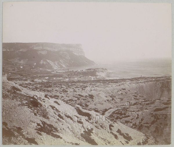 Curator: Standing before us is a photograph titled "Gezicht op een kaap in Griekenland, aangeduid als Kaap Kolonnäs," which translates to "View of a Cape in Greece, referred to as Cape Kolonnäs." It was taken in 1898 by Johannes Lodewijk Heldring. Editor: It's a landscape shrouded in sepia tones, the scene holds a melancholic weight. The rolling hills leading to the promontory feel barren, silent, even under a deceptively bright sky. Curator: The "plein-air" notation in the metadata is interesting, given photography's inherent reliance on capturing light and atmosphere. You get a real sense of the landscape through Heldring's use of light. The composition seems intentionally stark, drawing the eye to the edge of the cape itself. There is also a tension here—it's realist in style but the processing renders an almost abstract vision. Editor: Barren indeed—but I think Heldring is trying to convey the despoilation of landscape here. Given his personal history and politics, he would likely view the region through that lens. Look how the washed out tones give the piece an antique veneer, but the very name, 'cape,' implies a historical context that is elided here—perhaps a knowing nod towards the exploitation inherent in classicism. Curator: Or, perhaps that 'emptiness' offers viewers a blank slate, and opportunity to project their own cultural memories and meanings onto the Greek landscape? The sea is such an old symbol in Mediterranean cultures. Is Heldring trying to say something with its apparent serenity, and the starkness of the surrounding vegetation? It invites an almost meditative reflection on timelessness and cultural origins. Editor: That reading is interesting but overlooks what seem to me deliberate obscurations—Heldring invites meditation precisely by frustrating any meaningful attachment to the historical contexts inherent in his location. Curator: Whether purposeful erasure or invitation to meditation, the work succeeds at engaging viewers and asking important questions about place, memory, and photographic representation. Editor: Agreed. It compels us to re-examine our expectations, the narratives we construct around familiar, yet often contested, geographies.