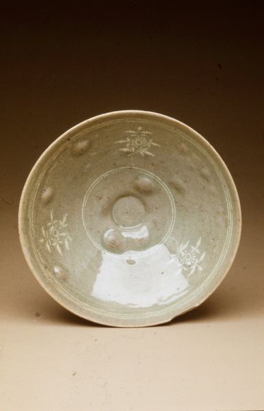 Editor: Here we have a ceramic bowl, simply titled "Bowl," dating back to the 13th or 14th century. Its soft celadon glaze gives it a serene, almost meditative quality. I’m curious, how do you interpret this seemingly simple object? Curator: Well, it’s precisely in its simplicity that its power lies. Celadon ware like this, produced during that time in Asia, wasn't just functional. The elite consumed luxury ceramics such as this. How might this relate to ideas about beauty, class and consumption during the medieval era in China or Korea? Editor: So, this bowl becomes more than just a bowl – it's a marker of social status? Curator: Exactly. The subtle elegance of celadon, its color, the precise carving of the floral motifs— these speak to a refined sensibility valued by those in power. The fact that it’s survived centuries, though with evident repairs, also hints at the object's value, not only economic but also sentimental or historical. Editor: You mention repairs. Do you see them as detracting from the piece? Curator: Not at all. They speak to a history of use, of changing hands, of perhaps surviving turbulent times. Those cracks tell a story. In some traditions, repairing objects is considered honoring them and accepting their imperfections. Editor: So it's like an intersection of art, history, and social commentary, all in one bowl? Curator: Precisely! It prompts us to question what we consider beautiful, valuable, and how these perceptions are shaped by our own social and historical contexts. Editor: I’ll definitely see ceramics in a new way now. Thanks for opening my eyes! Curator: And thank you for bringing your perspective – art history only truly lives when we continue to question it.