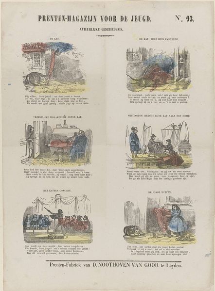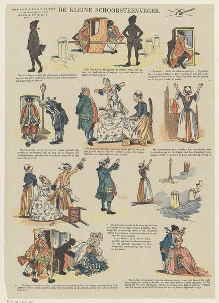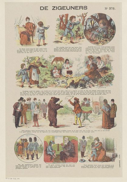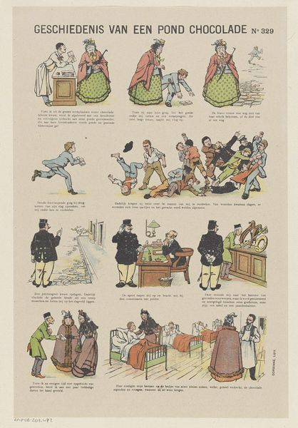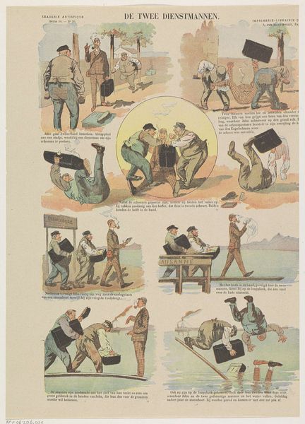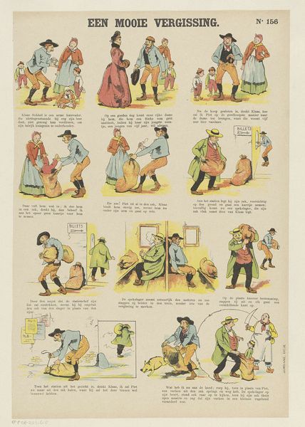 Felix Lacaille created this lithograph, 'Met den pleziertrein', to depict the cultural phenomenon of leisure travel and its impact on society. The print presents a series of vignettes that capture the chaotic and sometimes absurd experiences of travelling by train. It's likely from the late 19th century, given its themes and style. The composition uses caricature to critique the burgeoning tourism industry, particularly the overcrowding and the lengths to which people would go to save money, even hiding in luggage! Belgium, like much of Europe at this time, was experiencing rapid industrialization, leading to increased leisure time for the middle classes. Railway companies facilitated this by offering affordable excursions. This print serves as a social commentary, reflecting anxieties about changing social norms. One might also consider the role of illustrated publications in shaping public opinion and popular culture. Further research into the history of Belgian railways, travel advertisements, and social commentaries of the period would enrich our understanding of this print and its cultural significance. Ultimately, the value of this art lies in revealing the social and institutional contexts that shaped its production and reception.