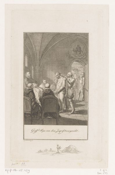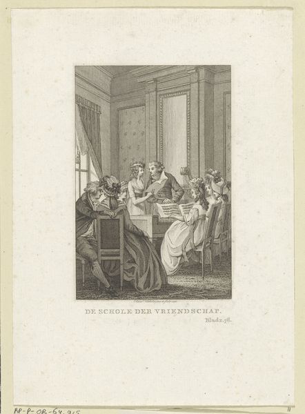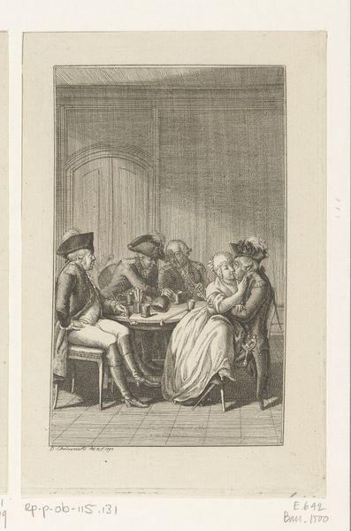 Daniel Nikolaus Chodowiecki made this print, "Pedro de Moya biedt Arsenie zijn manuscript aan," using etching. Chodowiecki was a Huguenot, of French Protestant descent, and his cultural background influenced his artistic themes and subjects. Here, the moment of exchange becomes a complex performance of social roles and power dynamics. The characters around the table are adorned in the attire of the time. The intersection of gender, class, and social status is subtly explored. The women's presence suggests their role in cultural and intellectual life. What is being presented and received, by whom, and under what circumstances? The bowing man, the seated woman, and the gathering of onlookers create a scene of subtle narrative tension. Chodowiecki's work invites us to reflect on the stories we tell about ourselves and others, revealing the intricate dance between identity, representation, and social expectation.