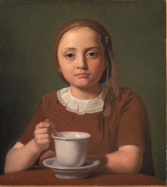 Editor: This painting, titled "Soup," was completed in 1865 by William Bouguereau, utilizing oil paint. The girl's expression is so knowing; she seems very self-aware. What do you see in this piece, particularly within the context of 19th-century genre painting? Curator: Bouguereau, though celebrated in his time, became something of a contentious figure in art history. This image presents a specific vision of childhood and poverty carefully curated for a middle-class audience. What is this image really *saying* about the poor, and to whom is it speaking? Is this a commentary on social conditions, or simply a romanticized depiction designed for sentimental appeal? Editor: That’s a really good point. The realism feels…calculated. The lighting is so dramatic for such an everyday scene. Curator: Exactly! Notice the cleanliness of the child, the deliberate tear in her smock - arranged just so. Bouguereau was a master of visual rhetoric, adept at constructing scenes that affirmed prevailing social hierarchies, whilst simultaneously engaging with realist and naturalist trends of the day. How does a museum balance celebrating artistic skill with analyzing social implications? Editor: It sounds like he's less interested in showing things as they *are* and more interested in crafting an appealing narrative for his patrons. A way to appreciate their own comfort, maybe? Curator: Precisely. These "genre paintings" often served as moral lessons and aesthetic diversions for the bourgeoisie, shaping and reinforcing specific understandings of class and poverty. Editor: This gives me so much to think about in terms of how art can function in a public context and shape societal views. I'll never look at a genre painting the same way again. Curator: Indeed, seeing art as actively participating in cultural and political dialogues changes how we engage with it in the present. Thanks for sharing your insights.